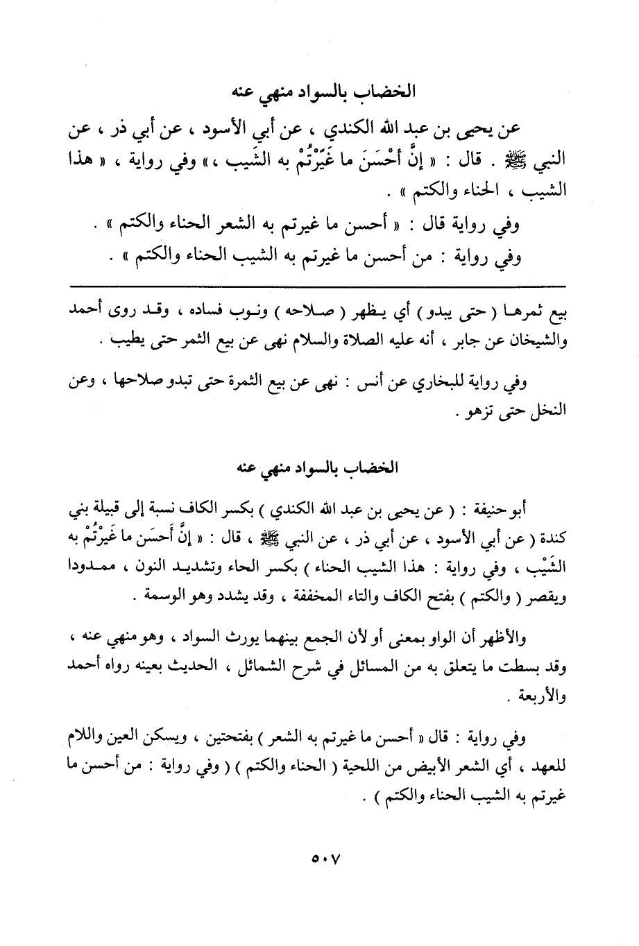 أبو حنيفة: (عن يحيى بن عبد الله الكندي) بكسر الكاف نسبة إلى قبيلة بني كندة (عن أبي الأسود، عن أبي ذر، عن النبي صلى الله عليه وسلم، قال: "إنَّ أَحسَن ما غَيرْتُمْ به الشَيْب، وفي رواية: هذا الشيب الحناء) بكسر الحاء وتشديد النون، ممدوداً ويقصر (والكتم) بفتح الكاف والتاء المخففة، وقد يشدد وهو الوسمة.