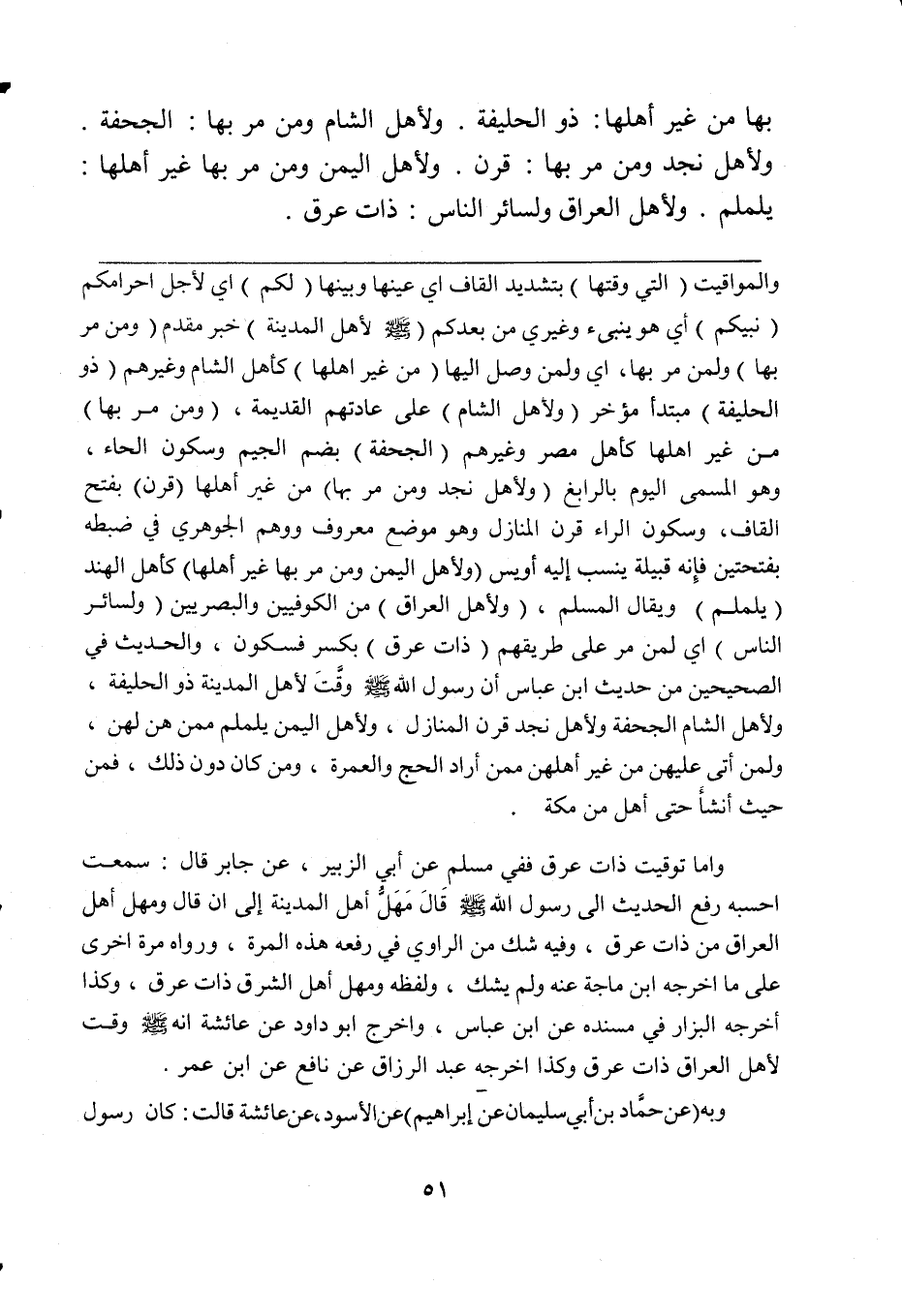 والمواقيت (التي وقتها) بتشديد القاف أي عينها وبينها (لكم) أي لأجل إحرامكم (نبيكم) أي هو ينبىء وغيري من بعدكم (صلى الله عليه وسلم لأهل المدينة) خبر مقدم (ومن مر بها) ولمن مر بها، أي ولمن وصل إليها (من غير أهلها) كأهل الشام وغيرهم (ذو الحليفة) مبتدأ مؤخر (ولأهل الشام) على عادتهم القديمة، (ومن مر بها) من غير أهلها كأهل مصر وغيرهم (الجحفة) بضم الجيم وسكون الحاء، وهو المسمى اليوم بالرابغ (ولأهل نجد ومن مر بها) من غير أهلها (قرن) بفتح القاف، وسكون الراء قرن المنازل وهو موضع معروف ووهم الجوهري في ضبطه بفتحتين فإنه قبيلة ينسب إليه أويس (ولأهل اليمن ومن مر بها غير أهلها) كأهل الهند (يلملم) ويقال المسلم، (ولأهل العراق) من الكوفيين والبصريين (ولسائر الناس) أي لمن مر على طريقهم (ذات عرق) بكسر فسكون، والحديث في الصحيحين من حديث ابن عباس أن رسول الله صلى الله عليه وسلم وقَّتَ لأهل المدينة ذو الحليفة، ولأهل الشام الجحفة ولأهل نجد قرن المنازل، ولأهل اليمن يلملم ممن هن لهن، ولمن أتى عليهن من غير أهلهن ممن أراد الحج والعمرة، ومن كان دون ذلك، فمن حيث أنشأ حتى أهل من مكة.