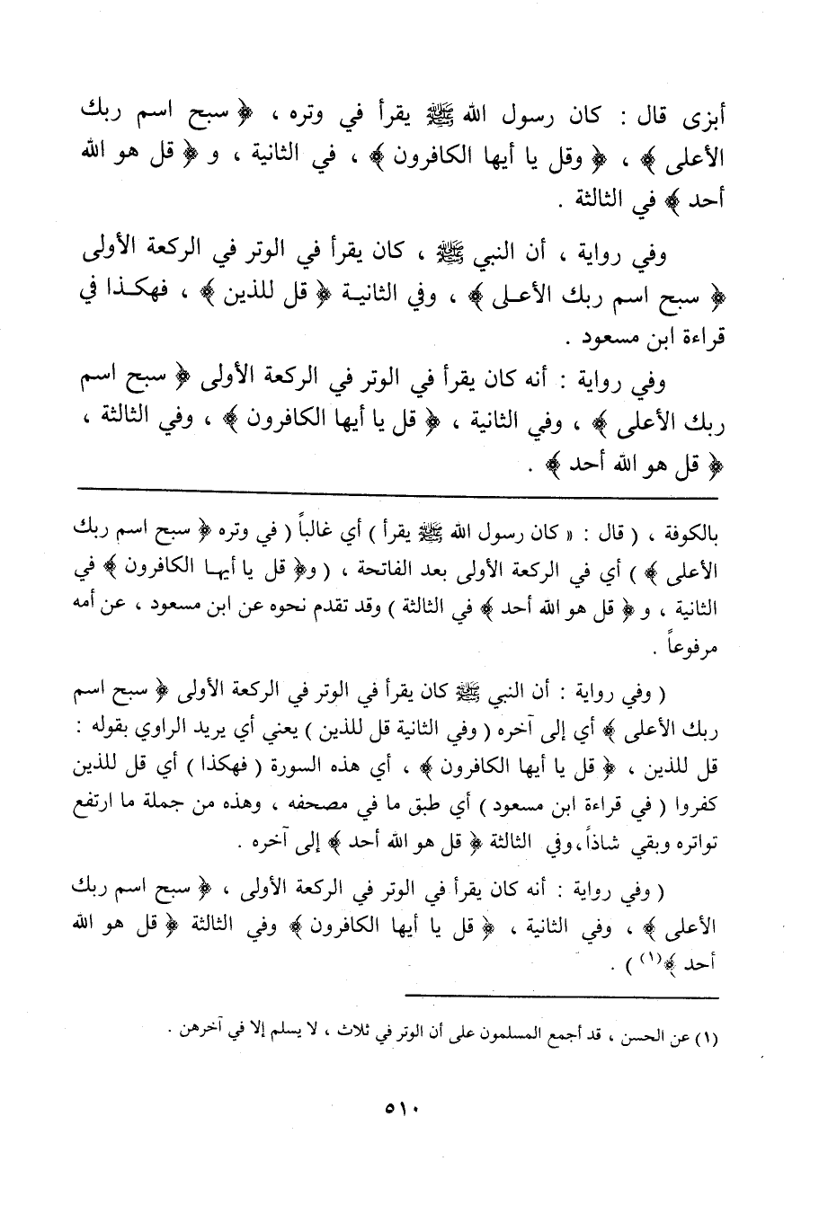 (¬1) عن الحسن، قد أجمع المسلمون على أن الوتر في ثلاث، لا يسلم إلا في آخرهن.