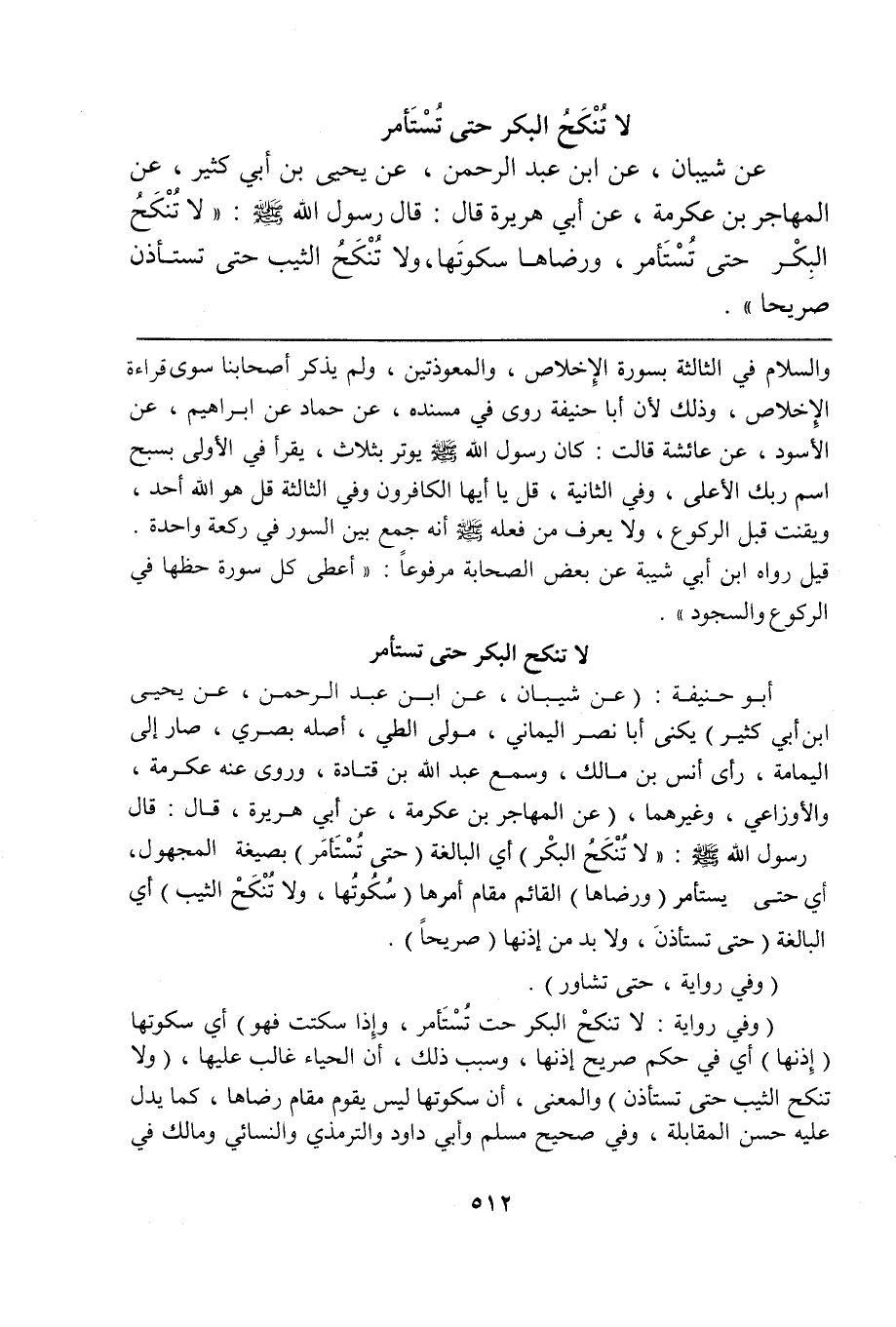 أبو حنيفة: (عن شيبان، عن ابن عبد الرحمن، عن يحيى ابن أبي كثير) يكنى أبا نصر اليماني، مولى الطي، أصله بصري، صار إلى اليمامة، رأى أنس بن مالك، وسمع عبد الله بن قتادة، وروى عنه عكرمة، والأوزاعي، وغيرهما، (عن المهاجر بن عكرمة، عن أبي هريرة، قال: قال رسول الله صلى الله عليه وسلم: "لا تُنْكَحُ البكْر) أي البالغة (حتى تُسْتَأمَر) بصيغة المجهول، أي حتى يستأمر (ورضاها) القائم مقام أمرها (سُكُوتُها، ولا تُنْكَحْ الثيب) أي البالغة (حتى تستأذنَ، ولا بد من إذنها (صريحاً).