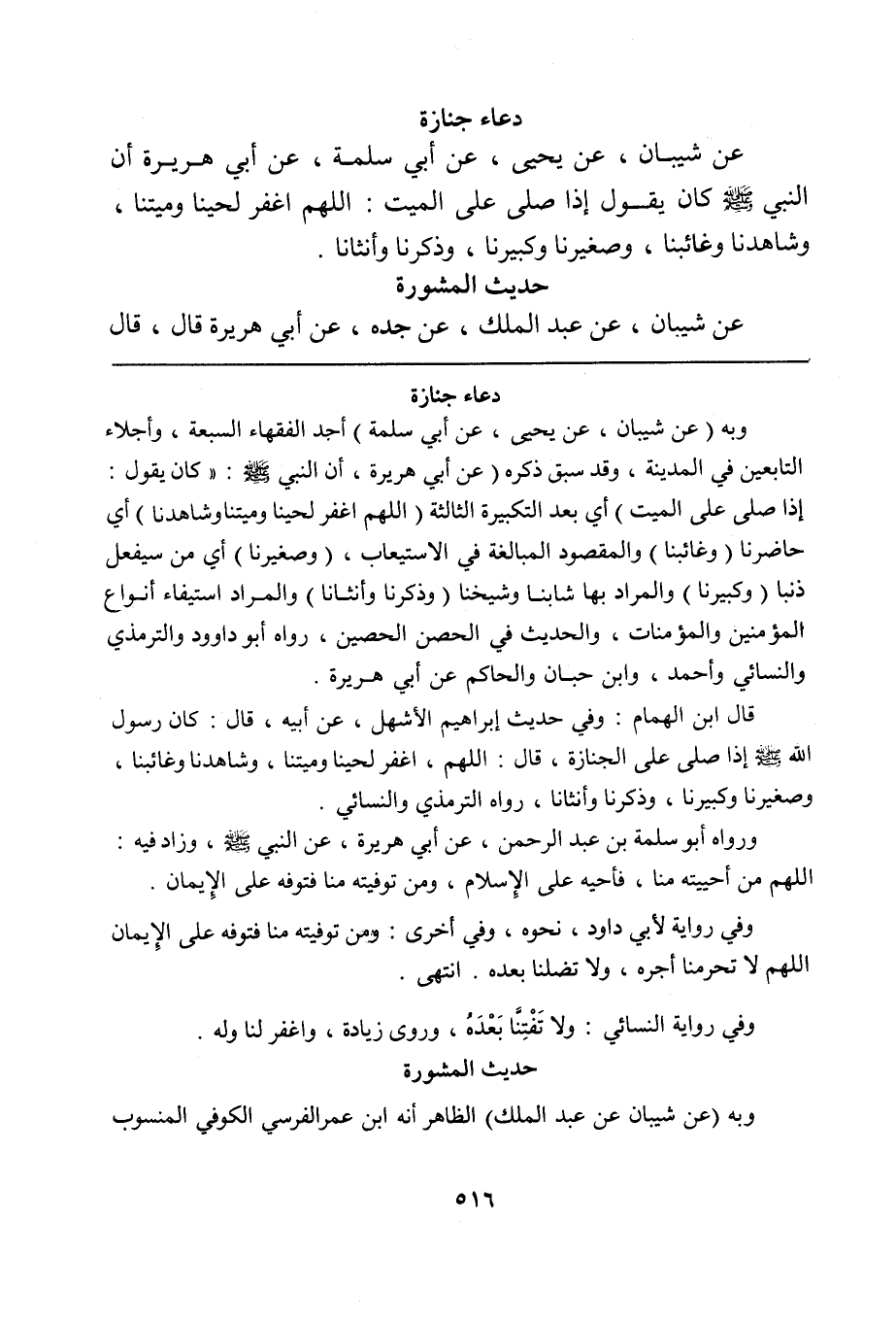 وبه (عن شيبان، عن يحيى، عن أبي سلمة) أحد الفقهاء السبعة، وأجلاء التابعين في المدينة، وقد سبق ذكره (عن أبي هريرة، أن النبي صلى الله عليه وسلم: "كان يقول: إذا صلى على الميت) أي بعد التكبيرة الثالثة (اللهم اغفر لحينا وميتنا وشاهدنا) أي حاضرنا (وغائبنا) والمقصود المبالغة في الاستيعاب، (وصغيرنا) أي من سيفعل ذنباً (وكبيرنا) والمراد بها شابنا وشيخنا (وذكرنا وأنثانا) والمراد استيفاء أنواع المؤمنين والمؤمنات، والحديث في الحصن الحصين، رواه أبو داود والترمذي والنسائي وأحمد، وابن حبان والحاكم عن أبي هريرة.