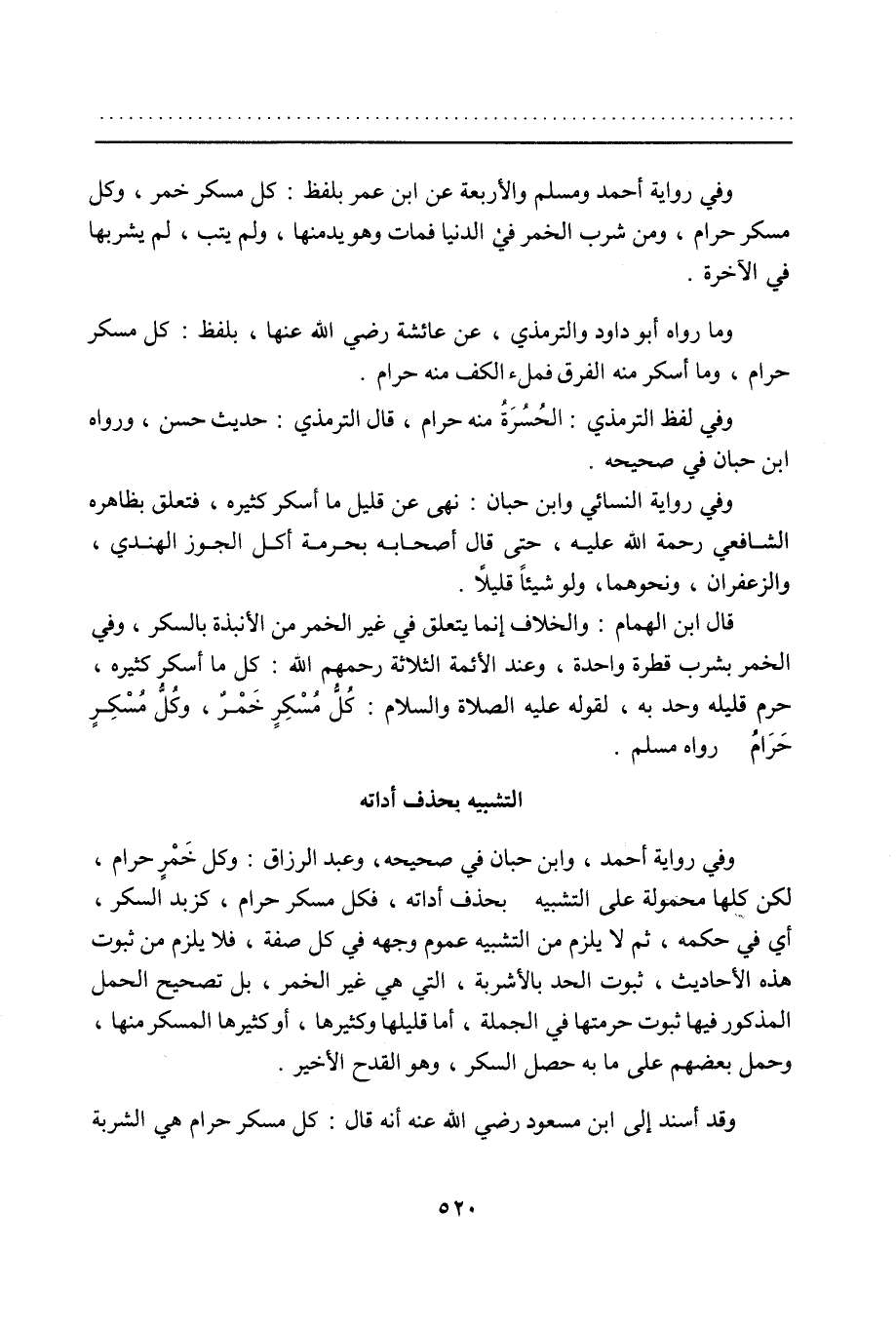 وفي رواية أحمد، وابن حبان في صحيحه، وعبد الرزاق: وكل خَمرٍ حرام، لكن كلها محمولة على التشبيه بحذف أداته، فكل مسكر حرام، كزبد السكر، أي في حكمه، ثم لا يلزم من التشبيه عموم وجهه في كل صفة، فلا يلزم من ثبوت هذه الأحاديث، ثبوت الحد بالأشربة، التي هي غير الخمر، بل تصحيح الحمل المذكور فيها ثبوت حرمتها في الجملة، أما قليلها وكثيرها، أو كثيرها المسكر منها، وحمل بعضهم على ما به حصل السكر، وهو القدح الأخير.