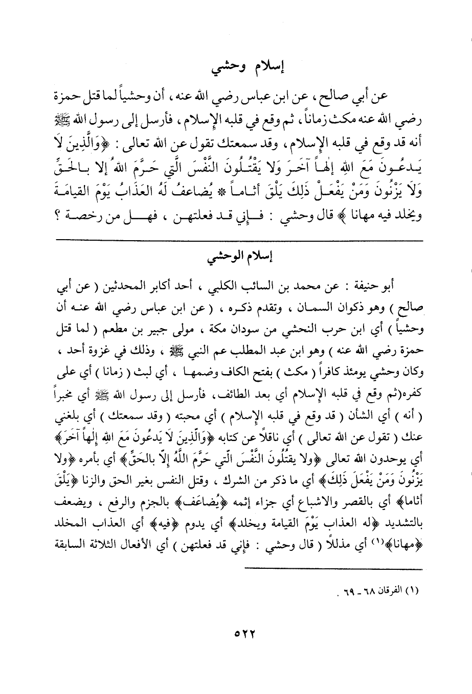 أبو حنيفة: عن محمد بن السائب الكلبي، أحد أكابر المحدثين (عن أبي صالح) وهو ذكوان السمان، وتقدم ذكره، (عن ابن عباس رضي الله عنه أن وحشياً) أي ابن حرب النحشي من سودان مكة، مولى جبير بن مطعم (لما قتل حمزة رضي الله عنه) وهو ابن عبد المطلب عم النبي صلى الله عليه وسلم، وذلك في غزوة أحد، وكان وحشي يومئذ كافراً (مكث) بفتح الكاف وضمها، أي لبث (زماناً) أي على كفره (ثم وقع في قلبه الإسلام) أي بعد الطائف، (فأرسل إلى رسول الله صلى الله عليه وسلم) أي مخبراً (أنه) أي الشأن (قد وقع في قلبه الإسلام) أي محبته (وقد سمعتك) أي بلغني عنك (تقول عن الله تعالى) أي ناقلاً عن كتابه ({وَالّذِينَ لاَ يَدعُونَ مَعَ الله إلهاً آخَرَ}) أي يوحدون الله تعالى ({ولا يقتُلُونَ النَّفْسَ الّتي حَرَّمَ الله إِلاّ بالحَقِّ}) أي بأمره ({ولا يَزْنُونَ وَمَنْ يَفْعَلَ ذَلِكَ}) أي ما ذكر من الشرك، وقتل النفس بغير الحق والزنا ({يَلْقَ أثاماً}) أي بالقصر والإشباع أي جزاء إثمه ({يُضاعَف}) بالجزم والرفع، ويضعف بالتشديد ({له العذاب يَوْمَ القيامة ويخلد}) أي يدوم ({فيه}) أي العذاب المخلد ({مهاناً}) (¬1) أي مذللاً (قال وحشي: فإني قد فعلتهن) أي الأفعال الثلاثة السابقة