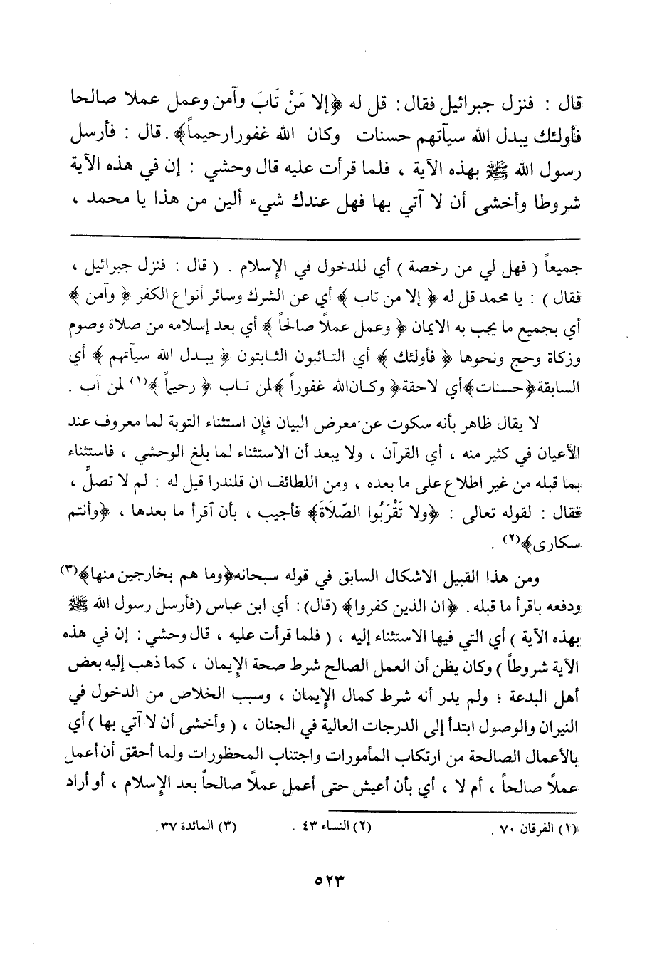 ومن هذا القبيل الاشكال السابق في قوله سبحانه {وما هم بخارجين منها} (¬3) ودفعه باقرأ ما قبله. {إن الذين كفروا} (قال): أي ابن عباس (فأرسل رسول الله صلى الله عليه وسلم بهذه الآية) أي التي فيها الاستثناء إليه، (فلما قرأت عليه، قال وحشي: إن في هذه الآية شروطاً) وكان يظن أن العمل الصالح شرط صحة الإيمان، كما ذهب إليه بعض أهل البدعة، ولم يدر أنه شرط كمال الإيمان، وسبب الخلاص من الدخول في النيران والوصول ابتدأ إلى الدرجات العالية في الجنان، (وأخشى أن لا آتي بها) أي بالأعمال الصالحة من ارتكاب المأمورات واجتناب المحظورات ولما أحقق أن أعمل عملاً صالحاً، أم لا، أي بأن أعيش حتى أعمل عملاً صالحاً بعد الإسلام، أو أراد