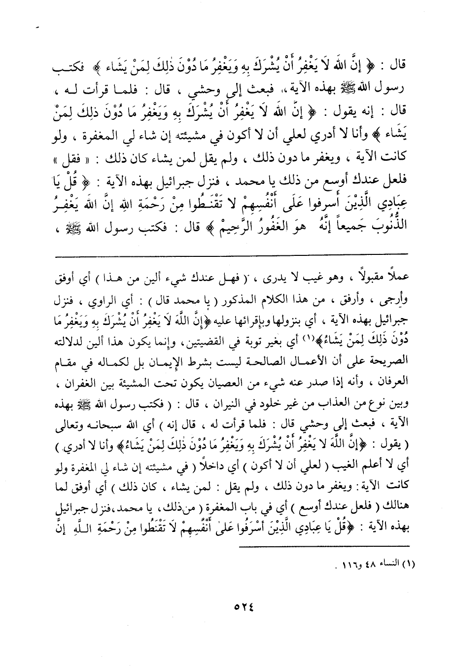عملاً مقبولاً، وهو غيب لا يدرى، (فهل عندك شيء ألين من هذا) أي أوفق، وأرجى، وأرفق، من هذا الكلام المذكور (يا محمد قال): أي الراوي، فنزل جبرائيل بهذه الآية، أي بنزولها وبإقرائها عليه ({إِنَّ الله لاَ يَغْفِرُ أَنْ يُشْرَكَ بِهِ وَيَغْفِرُ مَا دُوْنَ ذَلِكَ لِمَنْ يَشَاءُ}) (¬1) أي بغير توبة في القضيتين، وإنما يكون هذا ألين لدلالته الصريحة على أن الأعمال الصالحة ليست بشرط الإيمان بل لكماله في مقام العرفان، وأنه إذا صدر عنه شيء من العصيان يكون تحت المشيئة بين الغفران وبين نوع من العذاب من غير خلود في النيران، قال: (فكتب رسول الله صلى الله عليه وسلم بهذه الآية، فبعث إلى وحشي قال: فلما قرأت له، قال إنه) أي الله سبحانه وتعالى (يقول: {إنَّ الله لا يَغْفِرُ أَنْ يُشْرَكَ بِهِ وَيَغْفِرُ مَا دُوْنَ ذلِكَ لِمَنْ يَشَاءُ} وأنا لا أدري) أي لا أعلم الغيب (لعلي أن لا أكون) أي داخلاً (في مشيئته إن شاء لي المغفرة ولو كانت الآية: ويغفر ما دون ذلك، ولم يقل: لمن يشاء، كان ذلك) أي أوفق لما هنالك (فلعل عندك أوسع) أي في باب المغفرة (من ذلك، يا محمد، فنزل جبرائيل بهذه الآية: {قُلْ يَا عِبَادِي الَّذِينَ أسْرَفُوا على أَنْفُسِهمْ لاَ تَقْنَطُوا مِنْ رَحْمَةِ الله إنَّ