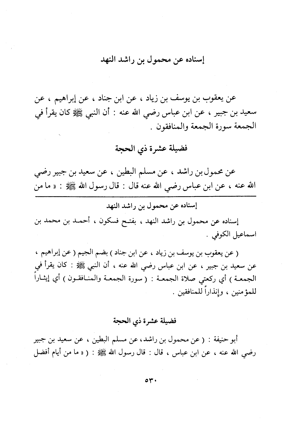أبو حنيفة: (عن محمول بن راشد، عن مسلم البطين، عن سعيد بن جبير رضي الله عنه، عن ابن عباس، قال: قال رسول الله صلى الله عليه وسلم: ("ما من أيام أفضل