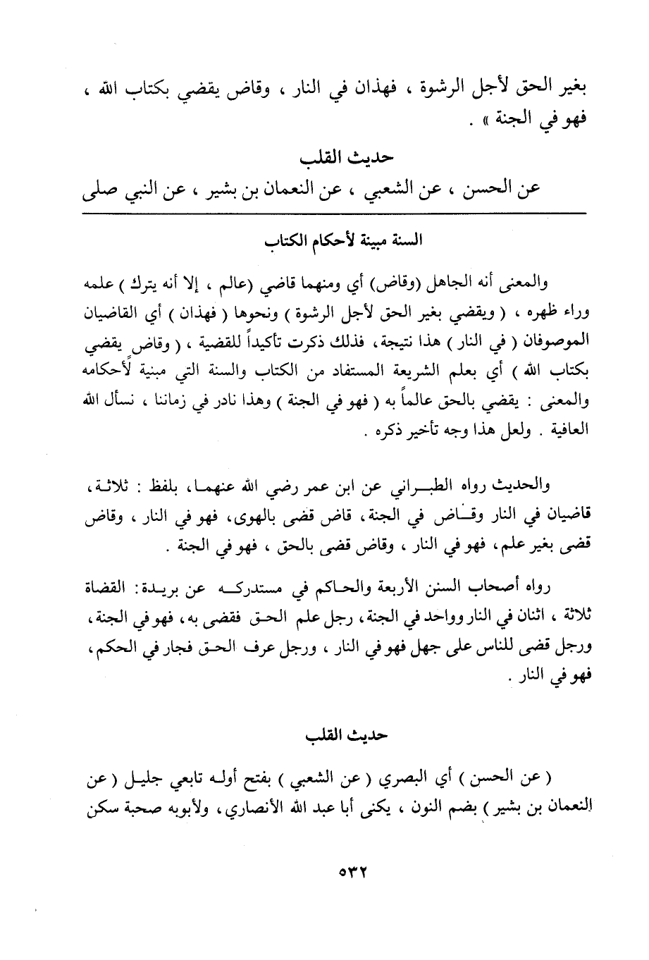 رواه أصحاب السنن الأربعة والحاكم في مستدركه عن بريدة: القضاة ثلاثة، اثنان في النار وواحد في الجنة، رجل علم الحق فقضى به، فهو في الجنة، ورجل قضى للناس على جهل فهو في النار، ورجل عرف الحق فجار في الحكم، فهو في النار.