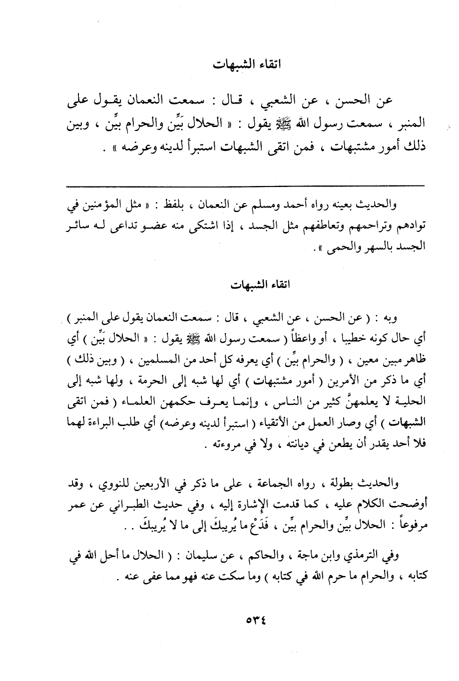 والحديث بطوله، رواه الجماعة، على ما ذكر في الأربعين للنووي، وقد أوضحت الكلام عليه، كما قدمت الإشارة إليه، وفي حديث الطبراني عن عمر مرفوعاً: الحلال بيِّن والحرام بيِّن، فَدَعْ ما يُريبكَ إلى ما لا يُريبكَ ..