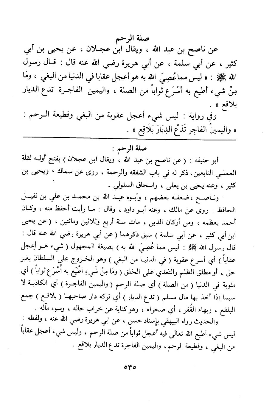 والحديث رواه البيهقي بإسناد حسن، عن أبي هريرة رضي الله عنه، ولفظه: ليس شيء أطيع الله تعالى فيه أعجل ثواباً من صلة الرحم، وليس شيء أعجل عقاباً من البغي، وقطيعة الرحم، واليمين الفاجرة تدع الديار بلاقع.