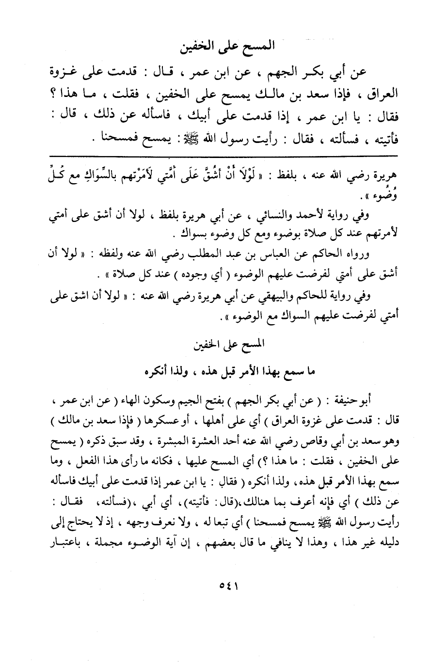 أبو حنيفة: (عن أبي بكر الجهم) بفتح الجيم وسكون الهاء (عن ابن عمر، قال: قدمت على غزوة العراق) أي على أهلها، أو عسكرها (فإذا سعد بن مالك) وهو سعد بن أبي وقاص رضي الله عنه أحد العشرة المبشرة، وقد سبق ذكره (يمسح على الخفين، فقلت: ما هذا؟) أي المسح عليها، فكأنه ما رأى هذا الفعل، وما سمع بهذا الأمر قبل هذه، ولذا أنكره (فقال: يا ابن عمر إذا قدمت على أبيك فاسأله عن ذلك) أي فإنه أعرف بما هنالك، (قال: فأتيته)، أي أبي، (فسألته، فقال: رأيت رسول الله صلى الله عليه وسلم يمسح فمسحنا) أي تبعاً له، ولا نعرف وجهه، إذ لا يحتاج إلى دليله غير هذا، وهذا لا ينافي ما قال بعضهم، إن آية الوضوء مجملة، باعتبار