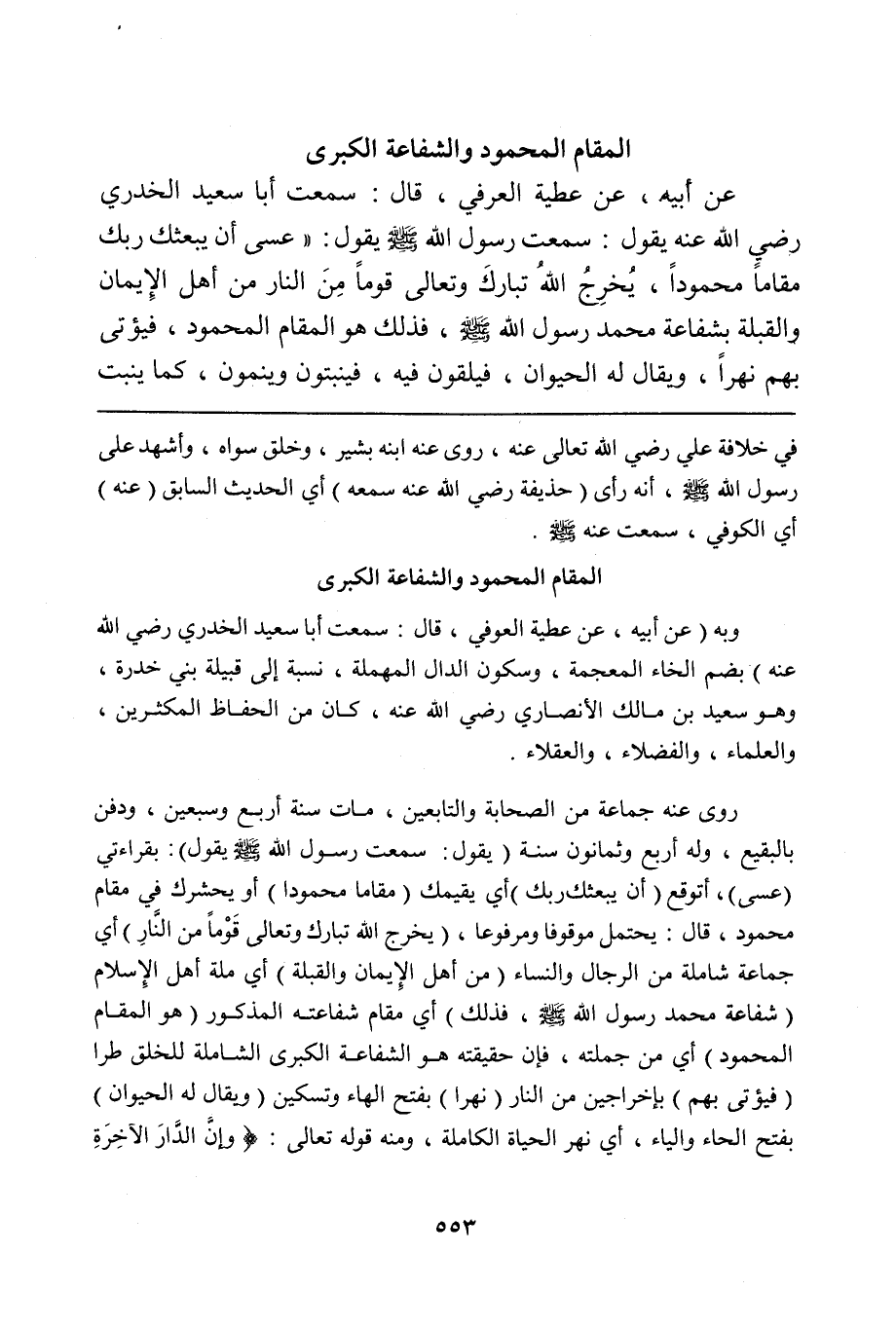 روى عنه جماعة من الصحابة والتابعين، مات سنة أربع وسبعين، ودفن بالبقيع، وله أربع وثمانون سنة (يقول: سمعت رسول الله صلى الله عليه وسلم يقول): بقراءتي (عسى)، أتوقع (أن يبعثك ربك) أي يقيمك (مقاماً محموداً) أو يحشرك في مقام محمود، قال: يحتمل موقوفاً ومرفوعاً، (يخرج الله تبارك وتعالى قَوْماً من النَّارِ) أي جماعة شاملة من الرجال والنساء (من أهل الإيمان والقبلة) أي ملة أهل الإسلام (بشفاعة محمد رسول الله صلى الله عليه وسلم، فذلك) أي مقام شفاعته المذكور (هو المقام المحمود) أي من جملته، فإن حقيقته هو الشفاعة الكبرى الشاملة للخلق طراً (فيؤتى بهم) بإخراجين من النار (نهراً) بفتح الهاء وتسكين (ويقال له الحيوان) بفتح الحاء والياء، أي نهر الحياة الكاملة، ومنه قوله تعالى: {وإنَّ الدَّارَ الآخِرَة