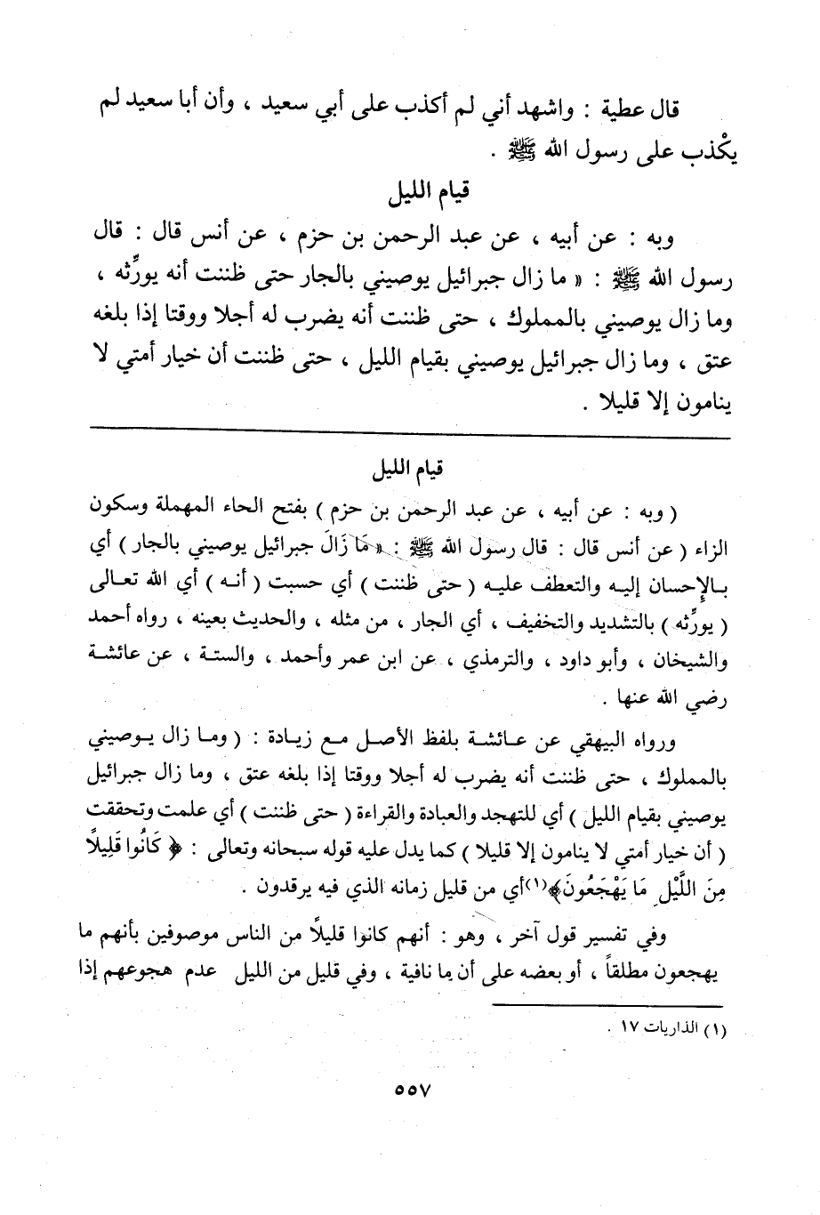 ورواه البيهقي عن عائشة بلفظ الأصل مع زيادة: (وما زال يوصيني بالمملوك، حتى ظننت أنه يضرب له أجلاً ووقتاً إذا بلغه عتق، وما زال جبرائيل يوصيني بقيام الليل) أي للتهجد والعبادة والقراءة (حتى ظننت) أي علمت وتحققت (أن خيار أمتي لا ينامون إلا قليلاً) كما يدل عليه قوله سبحانه وتعالى: {كَانُوا قَلِيلاً مِنَ اللَّيْلِ مَا يَهْجَعُونَ} (¬1) أي من قليل زمانه الذي فيه يرقدون.