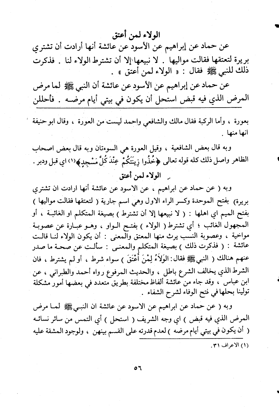 وبه (عن حماد عن إبراهيم، عن الأسود عن عائشة أنها أرادت أن تشتري بريرة) بفتح الموحدة وكسر الراء الأول وهي اسم جارية (لتعتقها فقالت مواليها) بفتح الميم أي أهلها: (لا نبيعها إلا أن تشترط) بصيغة المتكلم أو الغائبة، أو المجهول الغائب؛ أي تشترط (الولاء) بفتح الواو، وهي عبارة عن عصوبة مواخية، وعصوبة النسب يرث منها المعتق والمعنى: أن يكون الولاء لنا قالت عائشة: (فذكرت ذلك) بصيغة المتكلم والمعنى: سألت عن صحة ما صدر عنهم هنالك (النبي صلى الله عليه وسلم فقال: الوَلاَءُ لِمَنْ أَعْتَقَ) سواء شرط، أو لم يشترط، فإن الشرط الذي يخالف الشرع باطل، والحديث المرفوع رواه أحمد والطبراني، عن ابن عباس، وقد جاء من عائشة ألفاظ مختلفة بطريق متعدد في بعضها أمور مشكلة تولينا بحلها في فتح الوفاء لشرح الشفاء.