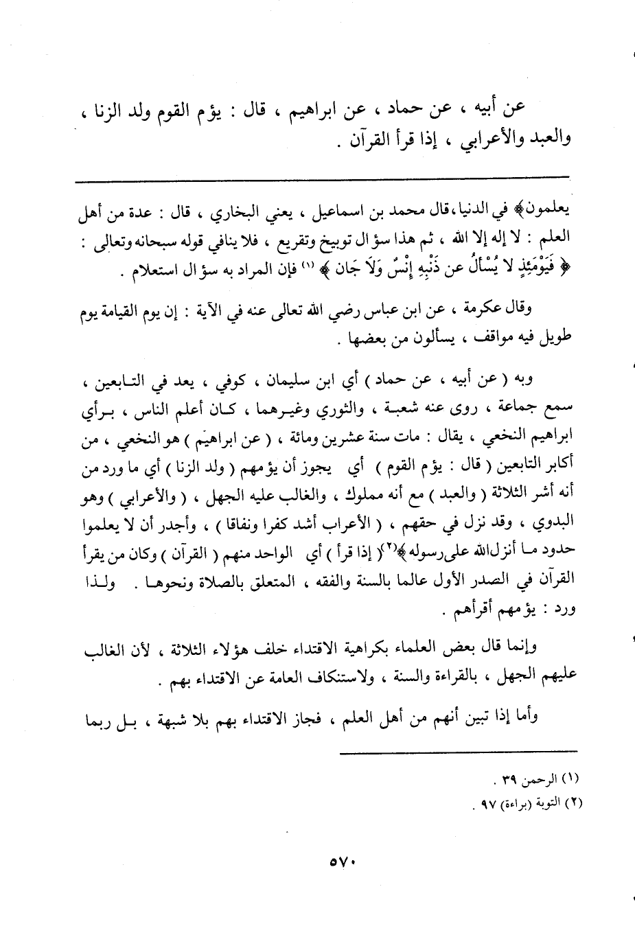 وبه (عن أبيه، عن حماد) أي ابن سليمان، كوفي، يعد في التابعين، سمع جماعة، روى عنه شعبة، والثوري وغيرهما، كان أعلم الناس، برأي إبراهيم النخعي، يقال: مات سنة عشرين ومائة، (عن إبراهيم) هو النخعي، من أكابر التابعين (قال: يؤم القوم) أي يجوز أن يؤمهم (ولد الزنا) أي ما ورد من أنه أشر الثلاثة (والعبد) مع أنه مملوك، والغالب عليه الجهل، (والأعرابي) وهو البدوي، وقد نزل في حقهم: {الأعراب أشد كفراً ونفاقاً وأجدر ألا يعلموا حدود ما أنزل الله على رسوله} (¬2) (إذا قرأ) أي الواحد منهم (القرآن) وكان من يقرأ القرآن في الصدر الأول عالماً بالسنة والفقه، المتعلق بالصلاة ونحوها. ولذا ورد: يؤمهم أقرأهم.
