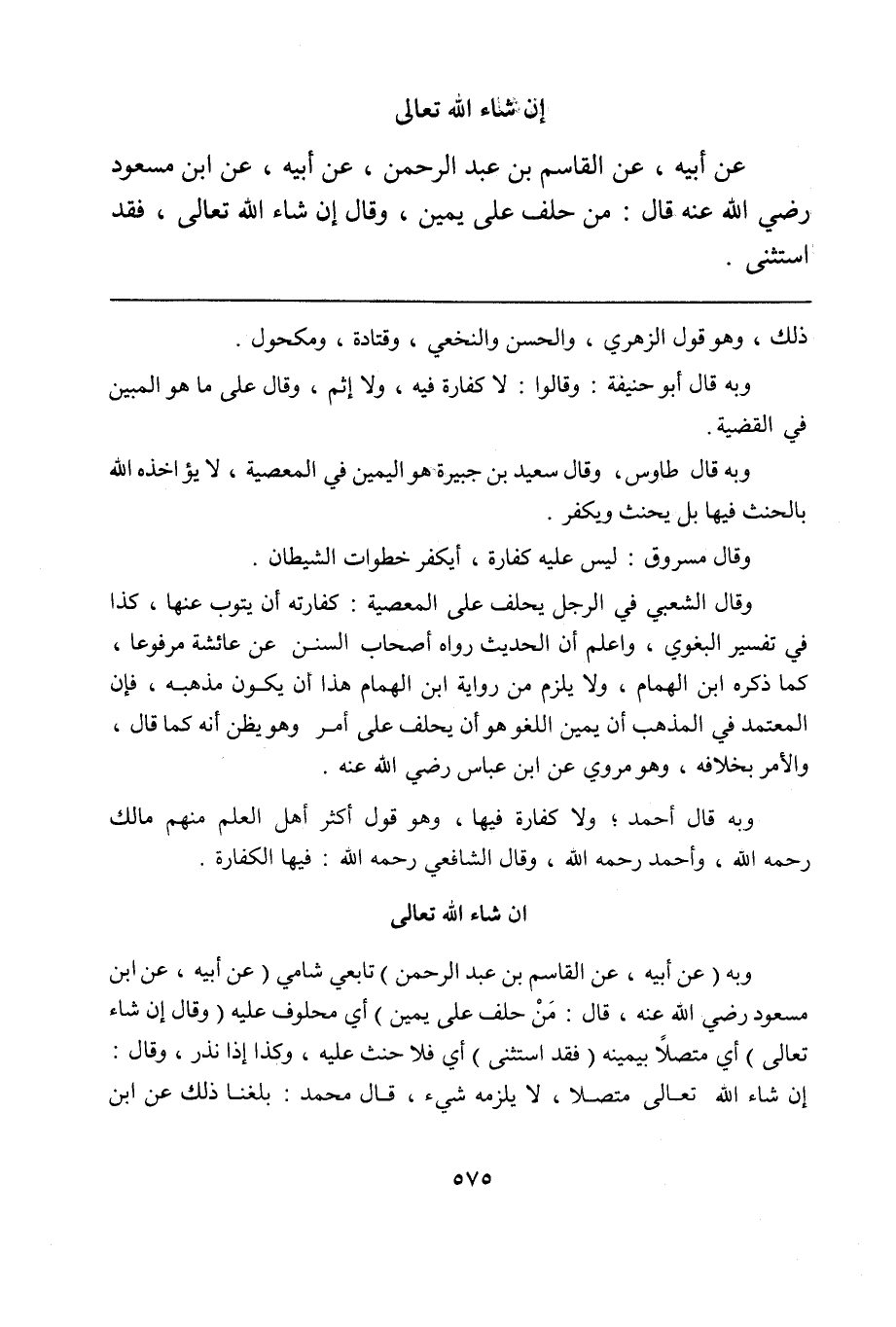 وبه (عن أبيه، عن القاسم بن عبد الرحمن) تابعي شامي (عن أبيه، عن ابن مسعود رضي الله عنه، قال: مَنْ حلف على يمين) أي محلوف عليه (وقال إن شاء تعالى) أي متصلاً بيمينه (فقد استثنى) أي فلا حنث عليه، وكذا إذا نذر، وقال: إن شاء الله تعالى متصلاً، لا يلزمه شيء، قال محمد: بلغنا ذلك عن ابن