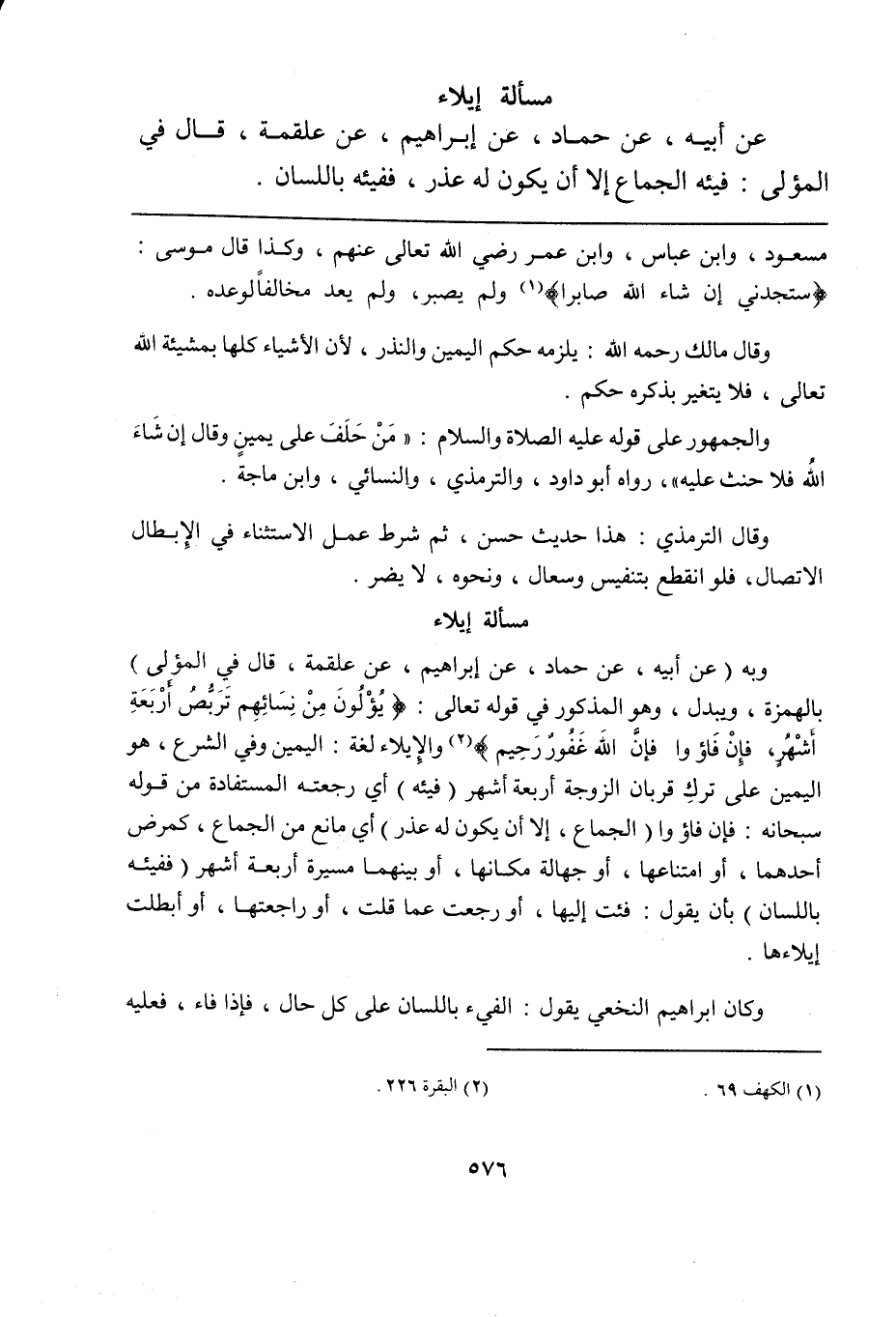 وبه (عن أبيه، عن حماد، عن إبراهيم، عن علقمة، قال في المؤلى) بالهمزة، ويبدل، وهو المذكور في قوله تعالى: {يُؤْلُونَ مِنْ نِسَائِهِم تَرَبُّصُ أَرْبَعَةِ أَشْهُرٍ، فإِنْ فَاؤوا فإنَّ الله غَفُورٌ رَحِيم} (¬2) والإيلاء لغة: اليمين، وفي الشرع: هو اليمين على تركِ قربان الزوجة أربعة أشهر (فيئة) أي رجعته المستفادة من قوله سبحانه: فإن فاؤوا (الجماع، إلا أن يكون له عذر) أي مانع من الجماع، كمرض أحدهما، أو امتناعها، أو جهالة مكانها، أو بينهما مسيرة أربعة أشهر (ففيئه باللسان) بأن يقول: فئت إليها، أو رجعت عما قلت، أو راجعتها، أو أبطلت إيلاءها.