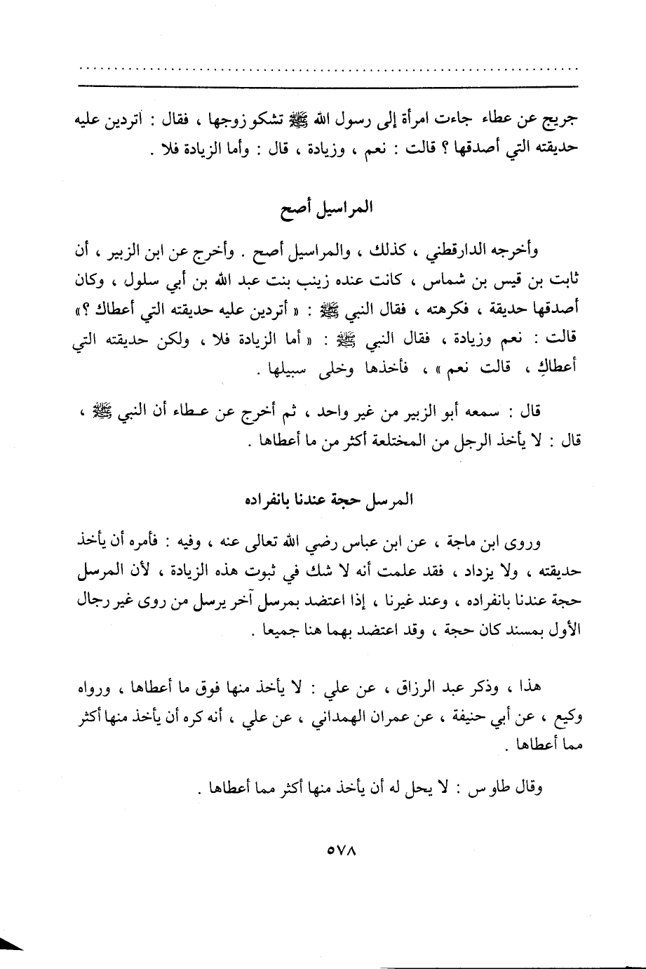 وأخرجه الدارقطني، كذلك، والمراسيل أصح. وأخرج عن ابن الزبير، أن ثابت بن قيس بن شماس، كانت عنده زينب بنت عبد الله بن أبي سلول، وكان أصدقها حديقة، فكرهته، فقال النبي صلى الله عليه وسلم: "أتردين عليه حديقته التي أعطاك؟ " قالت: نعم وزيادة، فقال النبي صلى الله عليه وسلم: "أما الزيادة فلا، ولكن حديقته التي أعطاكِ، قالت نعم"، فأخذها وخلى سبيلها.
