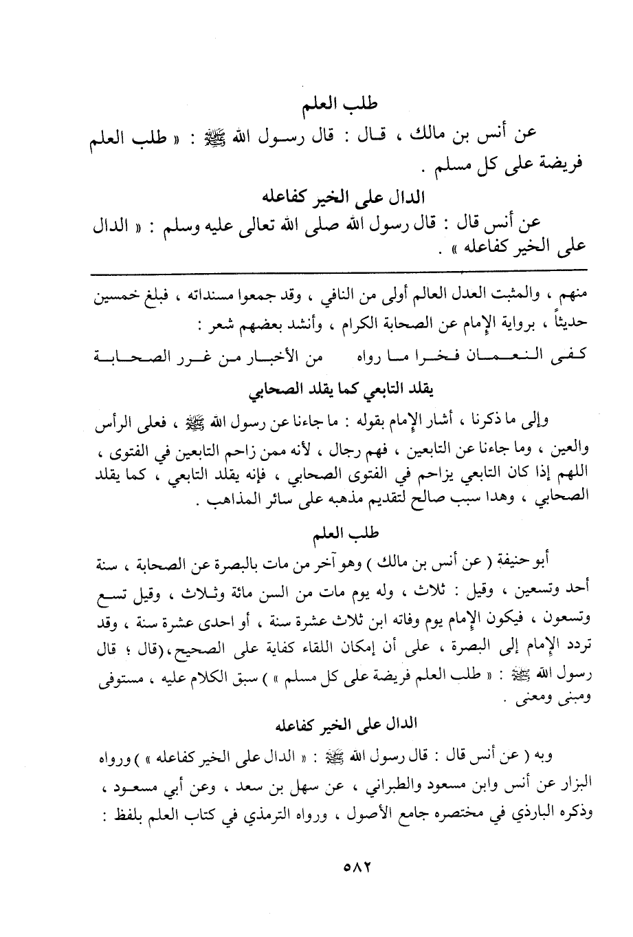 أبو حنيفة (عن أنس بن مالك) وهو آخر من مات بالبصرة من الصحابة، سنة أحد وتسعين، وقيل: ثلاث، وله يوم مات من السن مائة وثلاث، وقيل تسع وتسعون، فيكون الإمام يوم وفاته ابن ثلاث عشرة سنة، أو إحدى عشرة سنة، وقد تردد الإمام إلى البصرة، على أن إمكان اللقاء كفاية على الصحيح، (قال؛ قال رسول الله صلى الله عليه وسلم: "طلب العلم فريضة على كل مسلم") سبق الكلام عليه، مستوفى مبنى ومعنى.