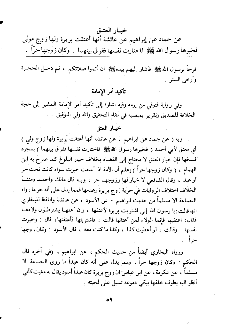 وبه (عن حماد عن إبراهيم، عن عائشة أنها أعتقت بَرِيرة ولها زوج مولى) أي معتق لأبي أحمد (فخيرها رسول الله صلى الله عليه وسلم فاختارت نفسها ففرق بينهما) بمجرد فسخها فإن خيار العتق لا يحتاج إلى القضاء بخلاف خيار البلوغ كما صرح به ابن الهمام، (وكان زوجها حراً) اعلم أن الأمة إذا أعتقت خيرت سواء كانت تحت حر أو عبد، وقال الشافعي لا خيار لها وزوجها حر، وبه قال مالك وأحمد ومنشأ الخلاف اختلاف الروايات في حرية زوج بريرة وعدمها فمما يدل على أنه حر ما رواه الجماعة إلا مسلماً من حديث إبراهيم،، عن الأسود، عن عائشة واللفظ للبخاري أنها قالت: يا رسول الله إني اشتريت بريرة لأعتقها، وإن أهلها يشترطون ولاءها فقال: أعتقيها فإنما الولاء لمن أعتقها قالت: فاشتريتها فأعتقتها، قال: وخيرت نفسها وقالت: لو أعطيت كذا، وكذا ما كنت معه، قال الأسود: وكان زوجها حراً.