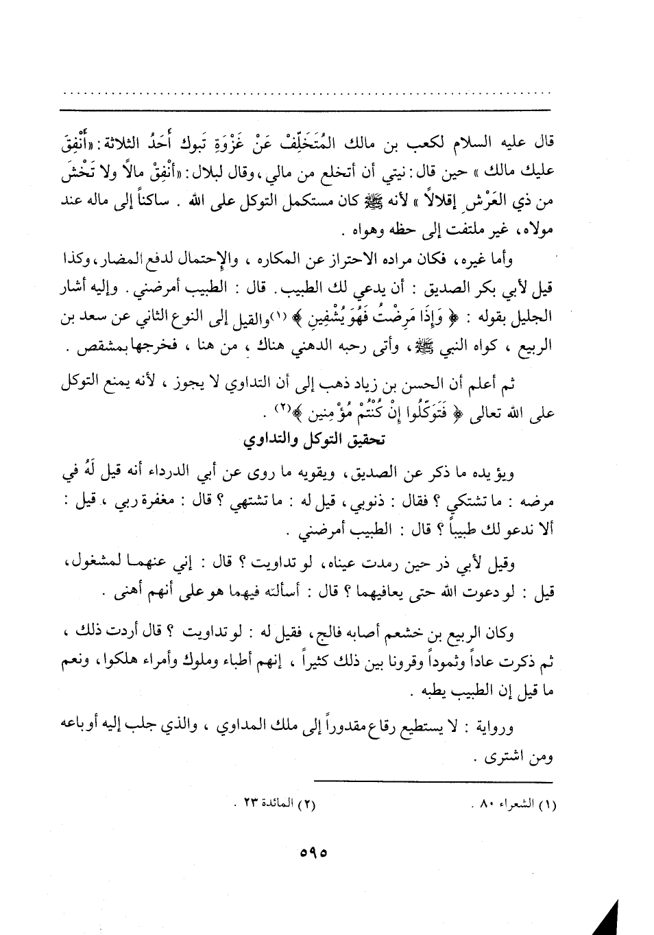 وأما غيره، فكان مراده الاحتراز عن المكاره، والاحتمال لدفع المضار، وكذا قيل لأبي بكر الصديق: أن يدعى لك الطبيب. قال: الطبيب أمرضني. وإليه أشار الجليل بقوله: {وَإذَا مَرِضْتُ فَهُوَ يُشْفِينِ} (¬1) والقيل إلى النوع الثاني عن سعد بن الربيع، كواه النبي صلى الله عليه وسلم، وأتى رحبه الدهني هناك، من هنا، فخرجها بمشقص.