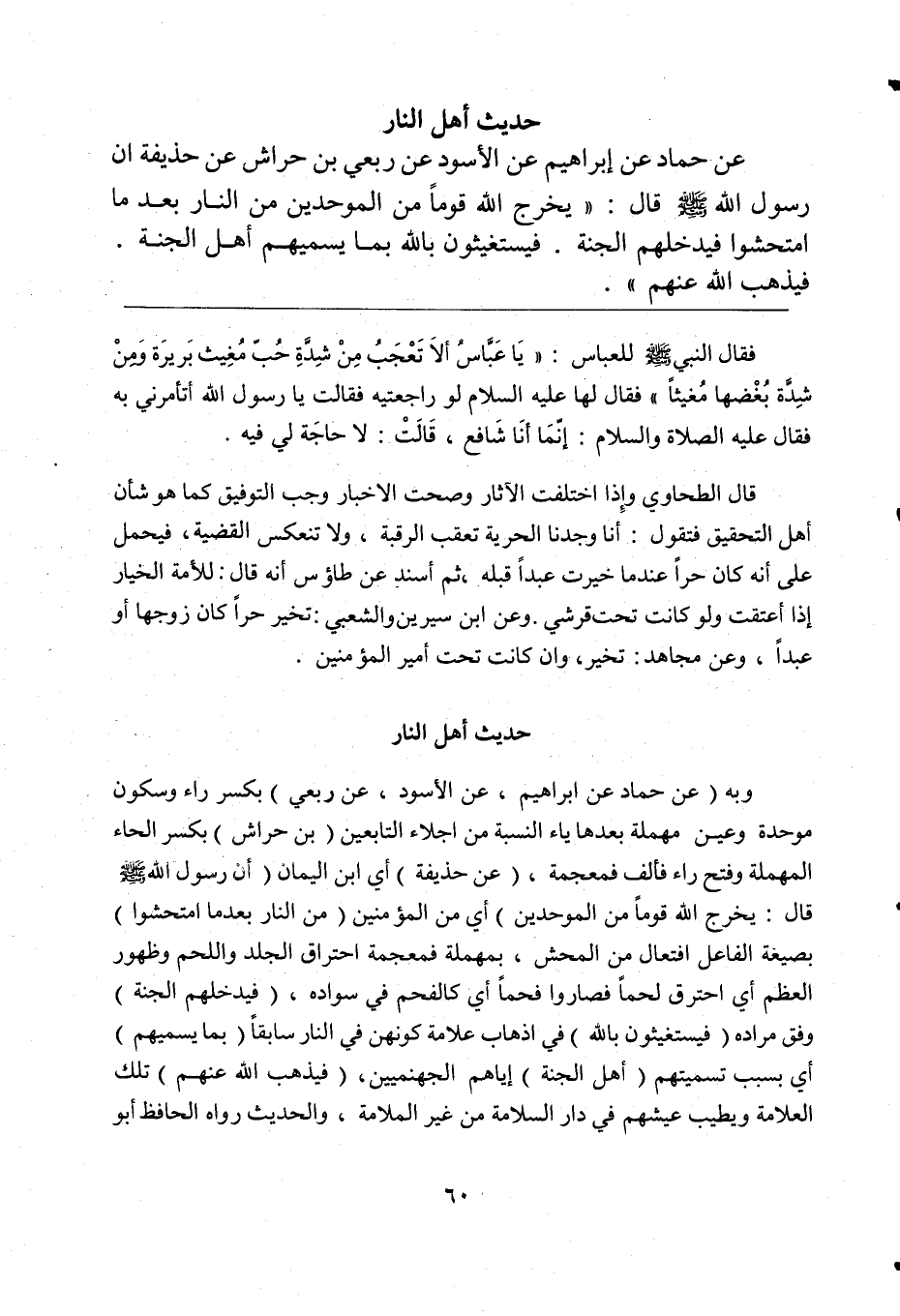 وبه (عن حماد عن إبراهيم، عن الأسود، عن ربعي) بكسر راء وسكون موحدة وعين مهملة بعدها ياء النسبة من أجلاء التابعين (بن حراش) بكسر الحاء المهملة وفتح راء فألف معجمة، (عن حذيفة) أي ابن اليمان (أن رسول الله صلى الله عليه وسلم قال: يخرج الله قوماً من الموحدين) أي من المؤمنين (من النار بعد ما امتحشوا) بصيغة الفاعل افتعال من المحش، بمهملة فمعجمة احتراق الجلد واللحم وظهور العظم أي احترق لحماً فصاروا فحماً أي كالفحم في سواده، (فيدخلهم الجنة) وفق مراده (فيستغيثون بالله) في إذهاب علامة كونهن في النار سابقاً (بما يسميهم) أي بسبب تسميتهم (أهل الجنة) إياهم الجهنميين، (فيذهب الله عنهم) تلك العلامة ويطيب عيشهم في دار السلامة من غير الملامة، والحديث رواه الحافظ أبو