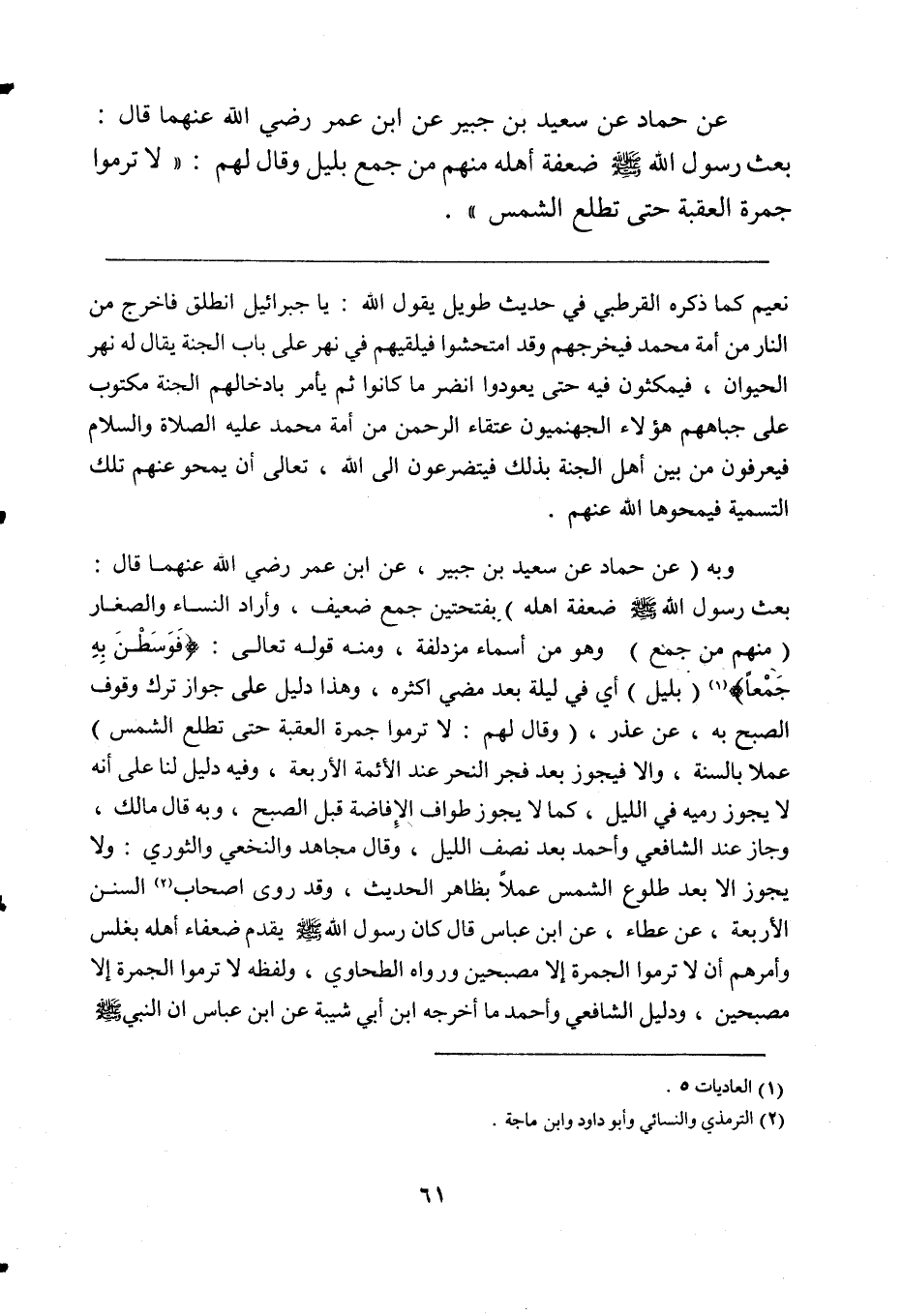 بعث رسول الله صلى الله عليه وسلم ضعفة أهله) بفتحتين جمع ضعيف، وأراد النساء والصغار (منهم من جمع) وهو من أسماء مزدلفة، ومنه قوله تعالى: {فَوَسَطْنَ بِهِ جَمْعاً} (¬1) (بليل) أي في ليلة بعد مضي أكثره، وهذا دليل على جواز ترك وقوف الصبح به، عن عذر، (وقال لهم: لا ترموا جمرة العقبة حتى تطلع الشمس) عملاً بالسنة، وإلا فيجوز بعد فجر النحر عند الأئمة الأربعة، وفيه دليل لنا على أنه لا يجوز رميه في الليل، كما لا يجوز طواف الإفاضة قبل الصبح، وبه قال مالك، وجاز عند الشافعي وأحمد بعد نصف الليل، وقال مجاهد والنخعي والثوري: ولا يجوز إلا بعد طلوع الشمس عملاً بظاهر الحديث، وقد روى أصحاب (¬2) السنن الأربعة، عن عطاء، عن ابن عباس قال كان رسول الله صلى الله عليه وسلم يقدم ضعفاء أهله بغلس وأمرهم أن لا ترموا الجمرة إلا مصبحين ورواه الطحاوي، ولفظه لا ترموا الجمرة إلا مصبحين، ودليل الشافعي وأحمد ما أخرجه ابن أبي شيبة عن ابن عباس أن النبي صلى الله عليه وسلم