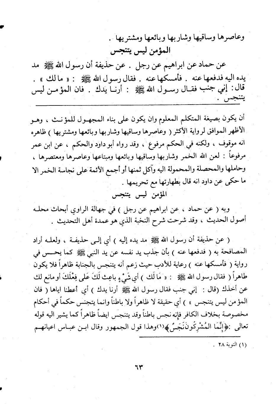 (عن حذيفة أن رسول الله صلى الله عليه وسلم مد يده إليه) أي إلى حذيفة، ولعله أراد المصافحة به (فدفعها عنه) بأن جذب يد نفسه عن يد النبي صلى الله عليه وسلم كما يحس في رواية (فأمسكها عنه) رعاية للأدب حيث زعم أنه يتنجس بالجنابة ظاهراً فلا يكون طاهراً (فقال رسول الله صلى الله عليه وسلم: "مَا لَك) أي شَيْءٍ باعِث لَكَ على فِعلَكَ أو مانع لك عن أخذك (قال: إني جنب فقال رسول الله صلى الله عليه وسلم: أرنا يدك) أي أعطنا إياها (فإن المؤمن ليس يتنجس") أي حقيقة لا ظاهراً ولا باطناً وإنما يتنجس حكماً في أحكام مخصوصة بخلاف الكافر فإنه نجس باطناً وقد يتنجس أيضاً ظاهراً كما يشير إليه قوله تعالى: {إِنَّمَا المُشْرِكُونَ نَجَسٌ} (¬1) وهذا قول الجمهور وقال ابن عباس أعيانهم