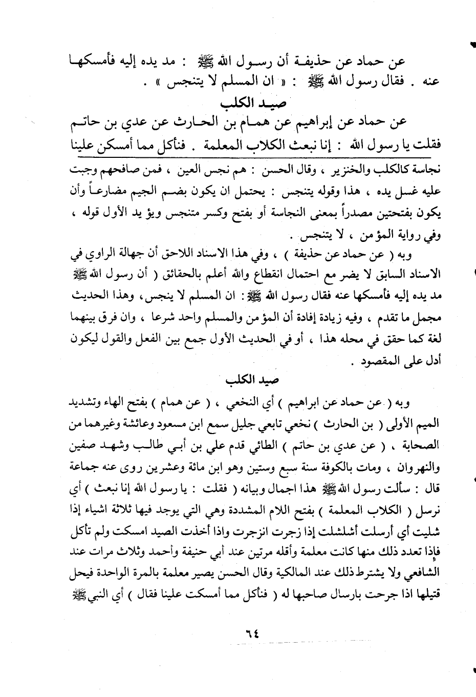 وبه (عن حماد عن حذيفة) وفي هذا الإسناد اللاحق أن جهالة الراوي في الإسناد السابق لا يضر مع احتمال انقطاع والله أعلم بالحقائق (أن رسول الله صلى الله عليه وسلم مد يده إليه فأمسكها عنه فقال رسول الله صلى الله عليه وسلم: إن المسلم لا ينجس، وهذا الحديث مجمل ما تقدم، وفيه زيادة إفادة أن المؤمن والمسلم واحد شرعاً، وإن فرق بينهما لغة كما حقق في محله هذا، أو في الحديث الأول جمع بين الفعل والقول ليكون أدل على المقصود.