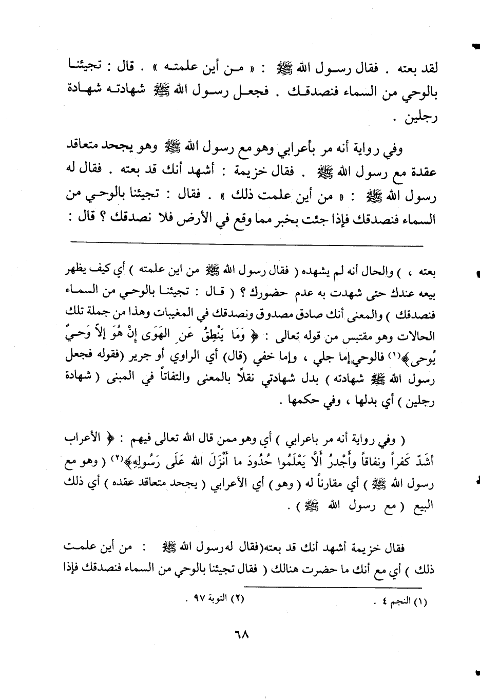 بعته) والحال أنه لم يشهده (فقال رسول الله صلى الله عليه وسلم من أين علمته) أي كيف يظهر بيعه عندك حتى شهدت به عدم حضورك؟ (قال: تجيئنا بالوحي من السماء فنصدقك) والمعنى أنك صادق مصدوق ونصدقك في المغيبات وهذا من جملة تلك الحالات وهو مقتبس من قوله تعالى: {وَمَا يَنْطِقُ عَنِ الهَوَى إنْ هُوَ إلاّ وَحيٌ يُوحى} (¬1) فالوحي إما جلي، وإما خفي (قال) أي الراوي أو جرير (فقوله فجعل رسول الله صلى الله عليه وسلم شهادته) بدل شهادتي نقلاً بالمعنى والتفاتاً في المبنى (شهادة رجلين) أي بدلها، وفي حكمها.