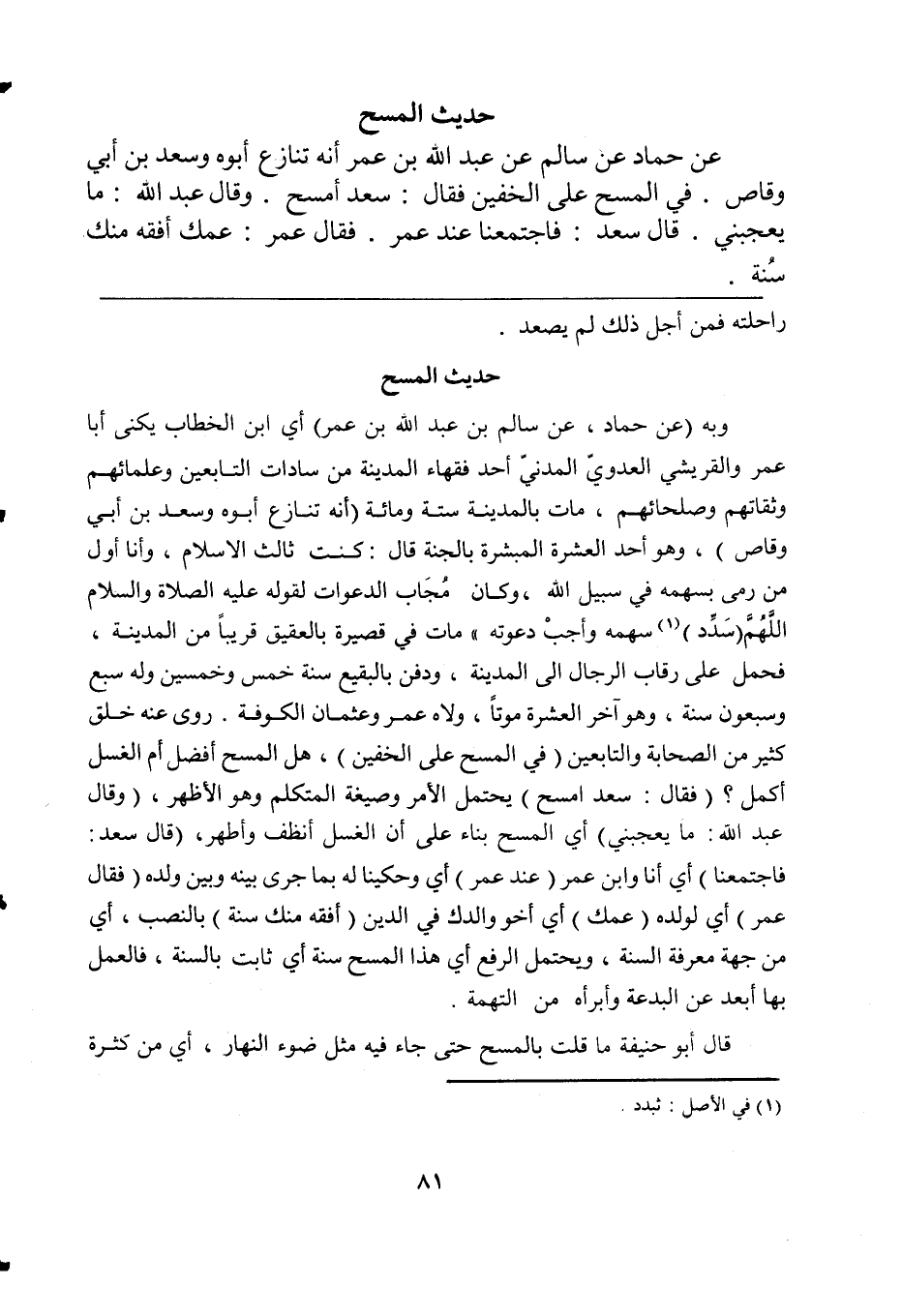 وبه (عن حماد، عن سالم بن عبد الله بن عمر) أي ابن الخطاب يكنى أبا عمر والقريشي العدوي المدنيّ أحد فقهاء المدينة من سادات التابعين وعلمائهم وثقاتهم وصلحائهم، مات بالمدينة ستة ومائة (أنه تنازع أبوه وسعد بن أبي وقاص)، وهو أحد العشرة المبشرة بالجنة قال: كنت ثالث الإسلام، وأنا أول من رمى بسهمه في سبيل الله، وكان مُجَاب الدعوات لقوله عليه الصلاة والسلام "اللهمَّ سدِّد (¬1) سهمه وأجب دعوته" مات في قصيرة بالعقيق قريباً من المدينة، فحمل على رقاب الرجال إلى المدينة، ودفن بالبقيع سنة خمس وخمسين وله سبع وسبعون سنة، وهو آخر العشرة موتاً، ولاه عمر وعثمان الكوفة. روى عنه خلق كثير من الصحابة والتابعين (في المسح على الخفين)، هل المسح أفضل أم الغسل أكمل؟ (فقال: سعد امسح) يحتمل الأمر وصيغة المتكلم وهو الأظهر، (وقال عبد الله: ما يعجبني) أي المسح بناء على أن الغسل أنظف وأطهر، (قال سعد: فاجتمعنا) أي أنا وابن عمر (عند عمر) أي وحكينا له بما جرى بينه وبين ولده (فقال عمر) أي لولده (عمك) أي أخو والدك في الدين (أفقه منك سنة) بالنصب، أي من جهة معرفة السنة، ويحتمل الرفع أي هذا المسح سنة أي ثابت بالسنة، فالعمل بها أبعد عن البدعة وأبرأه من التهمة.