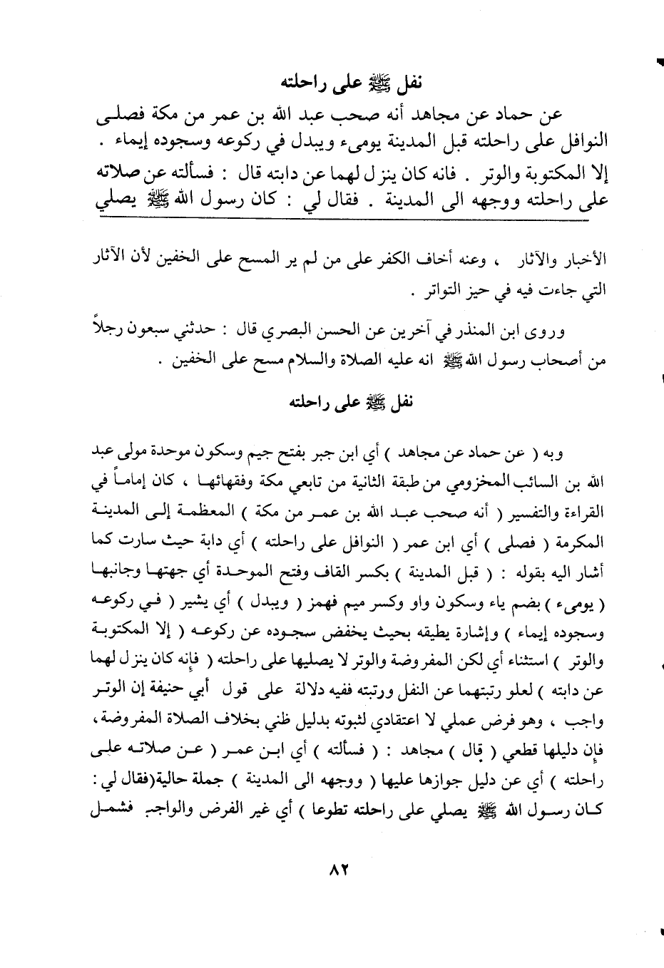 وبه (عن حماد عن مجاهد) أي ابن جبير بفتح الجيم وسكون موحدة مولى عبد الله بن السائب المخزومي من طبقة الثانية من تابعي مكة وفقهائها، كان إماماً في القراءة والتفسير (أنه صحب عبد الله بن عمر من مكة) المعظمة إلى المدينة المكرمة (فصلى) أي ابن عمر (النوافل على راحلته) أي دابة حيث سارت كما أشار إليه بقوله: (قبل المدينة) بكسر القاف وفتح الموحدة أي جهتها وجانبها (يومىء) بضم ياء وسكون واو وكسر ميم فهمز (ويبدل) أي يشير (في ركوعه وسجوده إيماء) وإشارة يطيقه بحيث يخفض سجوده عن ركوعه (إلا المكتوبة والوتر) استثناء أي لكن المفروضة والوتر لا يصليها على راحلته (فإنه كان ينزل لهما عن دابته) لعلو رتبتهما عن النفل ورتبته ففيه دلالة على قول أبي حنيفة إن الوتر واجب، وهو فرض عملي لا اعتقادي لثبوته بدليل ظني بخلاف الصلاة المفروضة فإن دليلها قطعي (قال) مجاهد: (فسألته) أي ابن عمر (عن صلاته على راحلته) أي عن دليل جوازها عليها (ووجهه إلى المدينة) جملة حالية (فقال لي: كان رسول الله صلى الله عليه وسلم يصلي على راحلته تطوعاً) أي غير الفرض والواجب فشمل
