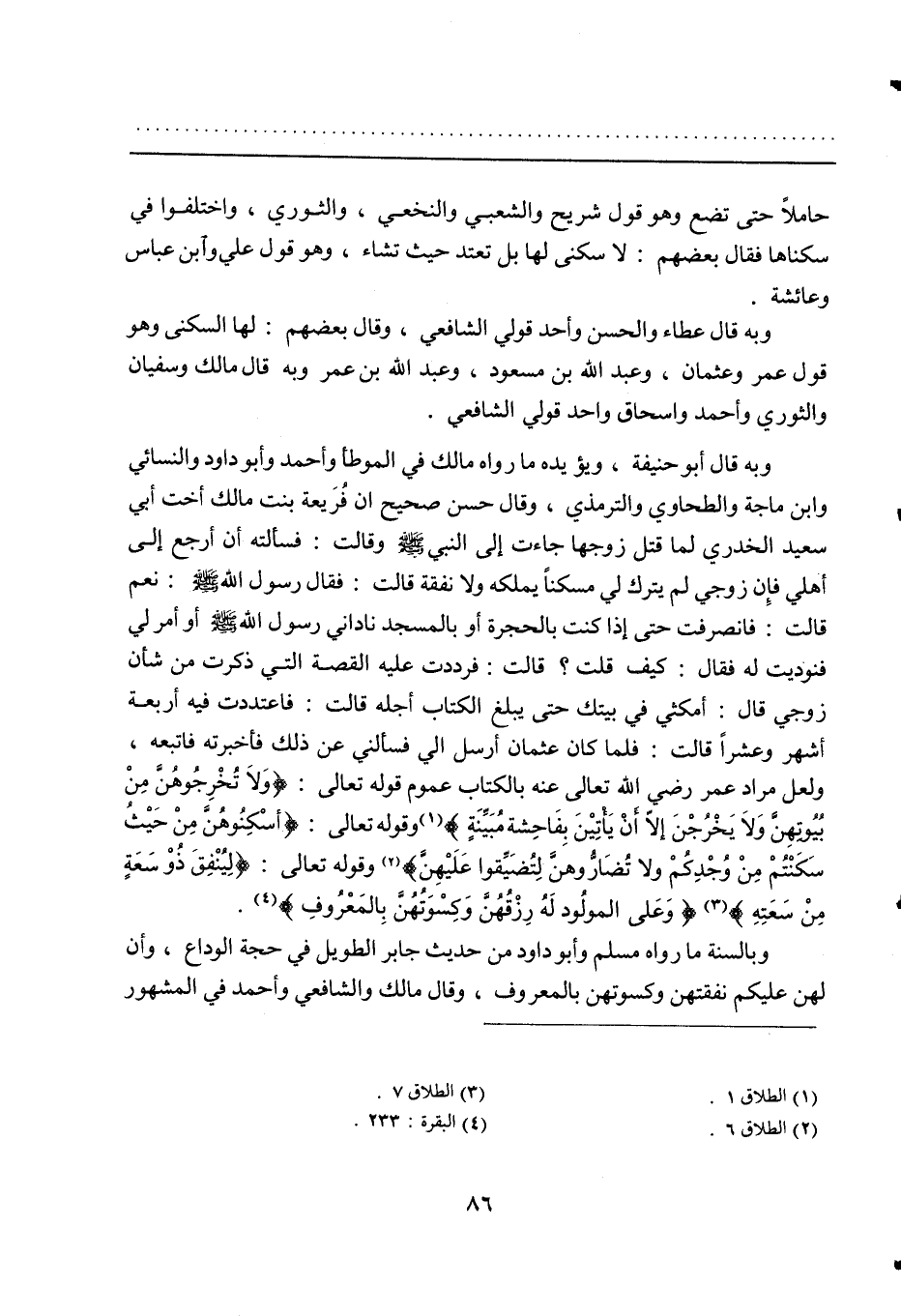 وبه قال أبو حنيفة، ويؤيده ما رواه مالك في الموطأ وأحمد وأبو داود والنسائي وابن ماجه والطحاوي والترمذي، وقال حسن صحيح أن فُرَيعة بنت مالك أخت أبي سعيد الخدري لما قتل زوجها جاءت إلى النبي صلى الله عليه وسلم وقالت: فسألته أن أرجع إلى أهلي فإن زوجي لم يترك لي مسكناً يملكه ولا نفقة قالت: فقال رسول الله صلى الله عليه وسلم: نعم قالت: فانصرفت حتى إذا كنت بالحجرة أو بالمسجد ناداني رسول الله صلى الله عليه وسلم أو أمر لي فنوديت له فقال: كيف قلت؟ قالت: فرددت عليه القصة التي ذكرت من شأن زوجي قال: امكثي في بيتك حتى يبلغ الكتاب أجله قالت: فاعتددت فيه أربعة أشهر وعشراً قالت: فلما كان عثمان أرسل إلي فسألني عن ذلك فأخبرته فاتبعه، ولعل مراد عمر رضي الله عنه بالكتاب قوله تعالى: {وَلاَ تُخْرِجُوهُنَّ مِنْ بُيُوتِهِنَّ وَلاَ يَخْرُجْنَ إلاّ أَنْ يَأتِينَ بفَاحِشة مُبَيِّنَةٍ} (¬1) وقوله تعالى: {أسكِنُوهُنَّ مِنْ حَيْثُ سَكَنْتُمْ مِنْ وُجْدِكُمْ ولا تُضَارُّوهنَّ لِتُضَيِّقوا عَلَيهِنَّ} (¬2) وقوله تعالى: {لِيُنفِقَ ذُو سَعَةٍ مِنْ سَعَتِهِ} (¬3) {وَعَلى المولُود لَهُ رِزْقُهُنَّ وَكِسوَتُهُنَّ بِالمَعْرُوفِ} (¬4).