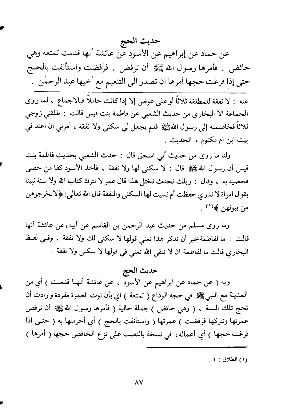 وما روى مسلم من حديث عبد الرحمن بن القاسم عن أبيه، عن عائشة أنها قالت: ما لفاطمة خبر أن تذكر هذا تعني قولها لا سكنى لك ولا نفقة، وفي لفظ البخاري قالت: ما لفاطمة أن لا تتقي الله تعني في قولها لا سكنى ولا نفقة.