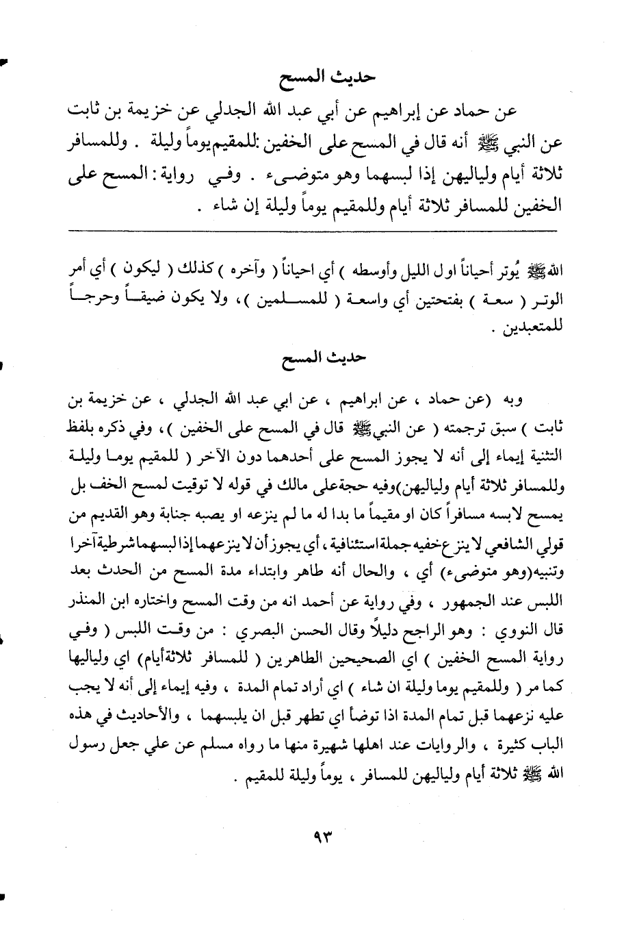 وبه (عن حماد، عن إبراهيم، عن أبي عبد الله الجدلي، عن خزيمة بن ثابت) سبق ترجمته (عن النبي صلى الله عليه وسلم قال في المسح على الخفين)، وفي ذكره بلفظ التثنية إيماء إلى أنه لا يجوز المسح على أحدهما دون الآخر (للمقيم يوماً وليلة وللمسافر ثلاثة أيام وليالهن) وفيه حجة على مالك في قوله لا توقيت لمسح الخف بل يمسح لابسه مسافراً كان أو مقيماً ما بدا له ما لم ينزعه أو يصبه جنابة وهو القديم من قولي الشافعي لا ينزع خفيه جملة استئنافية، أي يجوز أن لا ينزعهما إذا لبسهما شرطية آخراً وتنبيه (وهو متوضىء) أي، والحال أنه طاهر وابتداء مدة المسح من الحدث بعد اللبس عند الجمهور، وفي رواية عن أحمد أنه من وقت المسح واختاره ابن المنذر قال النووي: وهو الراجح دليلاً وقال الحسن البصري: من وقت اللبس (وفي رواية المسح على الخفين) أي الصحيحين الطاهرين (للمسافر ثلاثة أيام) أي ولياليها كما مر (وللمقيم يوماً وليلة إن شاء) أي أراد تمام المدة، وفيه إيماء إلى أنه لا يجب عليه نزعهما قبل تمام المدة إذا توضأ أي تطهر قبل أن يلبسهما، والأحاديث في هذا الباب كثيرة، والروايات عند أهلها شهيرة منها ما رواه مسلم عن علي جعل رسول الله صلى الله عليه وسلم ثلاثة أيام وليالهن للمسافر، ويوماً وليلة للمقيم.