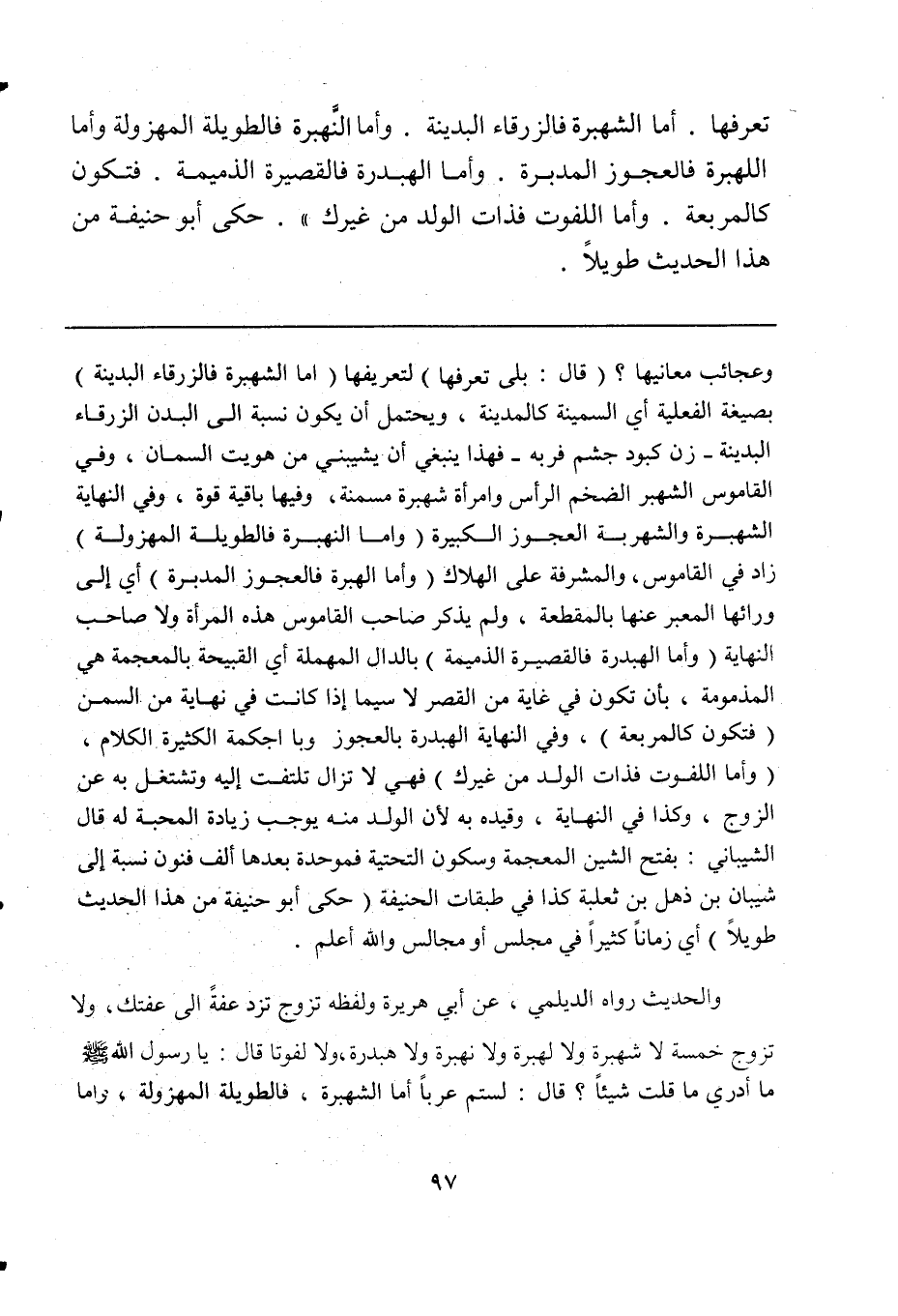 وعجائب معانيها؟ (قال: بلى تعرفها) لتعريفها (أما الشهبرة فالزرقاء البدينة) بصيغة الفعلية أي السمينة كالمدينة، ويحتمل أن يكون نسبة إلى البدن الزرقاء البدنية - زن كبود جشم فربه - فهذا ينبغي أن يشيبني من هويت السمان، وفي القاموس الشهبر الضخم الرأس وامرأة شهبرة مسمنة، وفيها باقية قوة، وفي النهاية الشهبرة والشهربة العجوز الكبيرة (وأما النهبرة فالطويلة المهزولة) زاد في القاموس، والمشرفة على الهلاك (وأما الهبرة فالعجوز المدبرة) أي إلى ورائها المعبر عنها بالمقطعة، ولم يذكر صاحب القاموس هذه المرأة ولا صاحب النهاية (وأما الهبدرة فالقصيرة الذميمة) بالدال المهملة أي القبيحة بالمعجمة هي المذمومة، بأن تكون في غاية القصر لا سيما إذا كانت في نهاية من السمن (فتكون كالمربعة)، وفي النهاية الهبدرة بالعجوز وبا اجكمة الكثيرة الكلام، (وأما اللفوت فذات الولد من غيرك) فهي لا تزال تلتفت إليه وتشتغل به عن الزوج، وكذا في النهاية، وقيده به لأن الولد منه يوجب زيادة المحبة له قال الشيباني: بفتح الشين المعجمة وسكون التحتية فموحدة بعدها ألف فنون نسبة إلى شيبان بن ذهل بن ثعلبة كذا في طبقات الحنيفة (حكى أبو حنيفة من هذا الحديث طويلاً) أي زماناً كثيراً في مجلس أو مجالس والله أعلم.