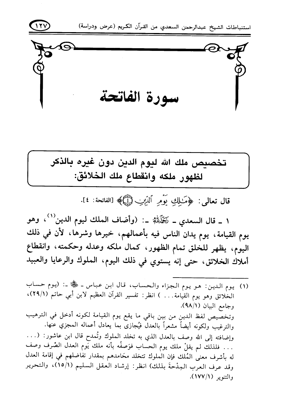 ١ - قال السعدي - رحمه الله -: (وأضاف الملك ليوم الدين (¬١)، وهو يوم القيامة، يوم يدان الناس فيه بأعمالهم، خيرها وشرها، لأن في ذلك اليوم، يظهر للخلق تمام الظهور، كمال ملكه وعدله وحكمته، وانقطاع أملاك الخلائق، حتى إنه يستوي في ذلك اليوم، الملوك والرعايا والعبيد
