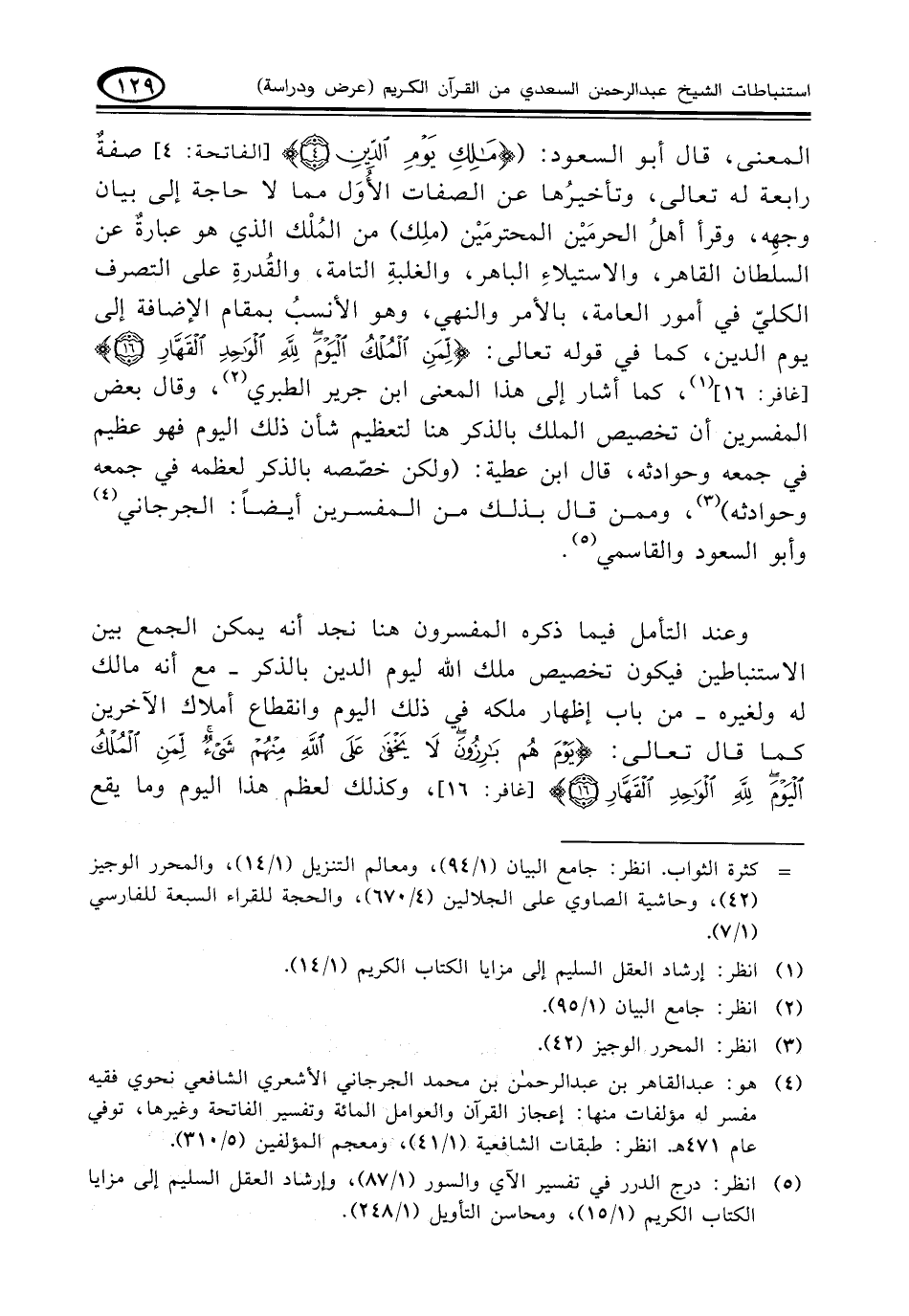 المعنى، قال أبو السعود: ({مَالِكِ يَوْمِ الدِّينِ (٤)} (الفاتحة: ٤) صفةٌ رابعة له تعالى، وتأخيرُها عن الصفات الأُوَل مما لا حاجة إلى بيان وجهِه، وقرأ أهلُ الحرمَيْن المحترمَيْن (ملِك) من المُلْك الذي هو عبارةٌ عن السلطان القاهر، والاستيلاءِ الباهر، والغلبةِ التامة، والقُدرةِ على التصرف الكليّ في أمور العامة، بالأمر والنهي، وهو الأنسبُ بمقام الإضافة إلى يوم الدين، كما في قوله تعالى: {لِمَنِ الْمُلْكُ الْيَوْمَ لِلَّهِ الْوَاحِدِ الْقَهَّارِ (١٦)} (غافر: ١٦)) (¬١)، كما أشار إلى هذا المعنى ابن جرير الطبري (¬٢)، وقال بعض المفسرين أن تخصيص الملك بالذكر هنا لتعظيم شأن ذلك اليوم فهو عظيم في جمعه وحوادثه، قال ابن عطية: (ولكن خصّصه بالذكر لعظمه في جمعه وحوادثه) (¬٣)، وممن قال بذلك من المفسرين أيضاً: