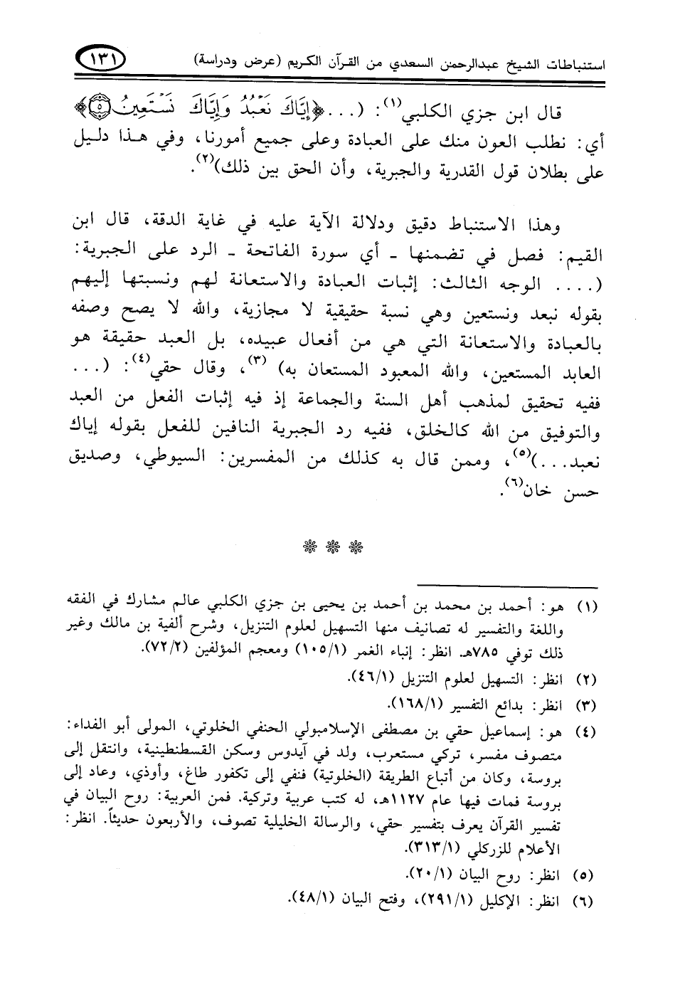 قال ابن جزي الكلبي (¬١): (. . . {إِيَّاكَ نَعْبُدُ وَإِيَّاكَ نَسْتَعِينُ (٥)} أي نطلب العون منك على العبادة وعلى جميع أمورنا، وفي هذا دليل على بطلان قول القدرية والجبرية، وأن الحق بين ذلك) (¬٢).
