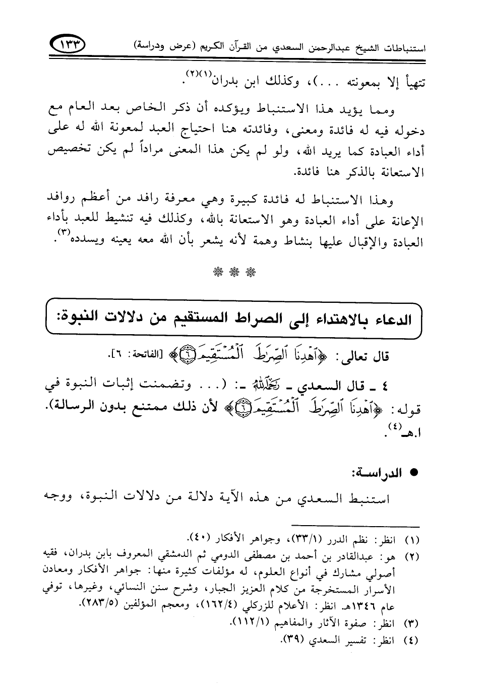 ٤ - قال السعدي - رحمه الله -: (. . . وتضمنت إثبات النبوة في قوله: {اهْدِنَا الصِّرَاطَ الْمُسْتَقِيمَ (٦)} لأن ذلك ممتنع بدون الرسالة) .ا. هـ (¬٤).