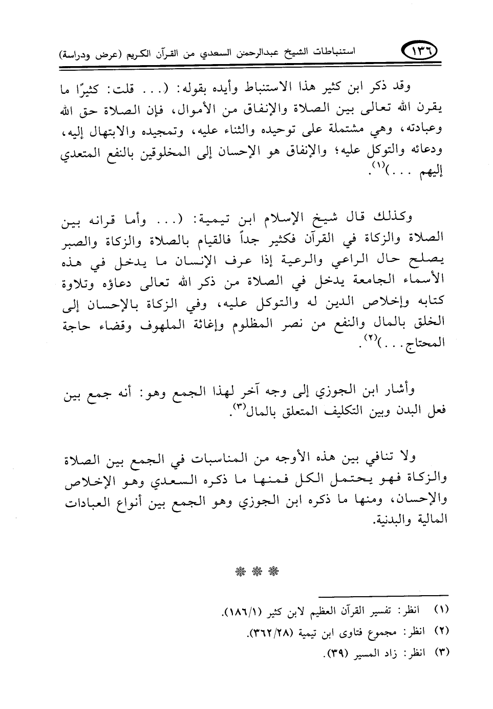 وقد ذكر ابن كثير هذا الاستنباط وأيده بقوله: (. . . قلت: كثيرًا ما يقرن الله تعالى بين الصلاة والإنفاق من الأموال، فإن الصلاة حق الله وعبادته، وهي مشتملة على توحيده والثناء عليه، وتمجيده والابتهال إليه، ودعائه والتوكل عليه؛ والإنفاق هو الإحسان إلى المخلوقين بالنفع المتعدي إليهم. . .) (¬١)
