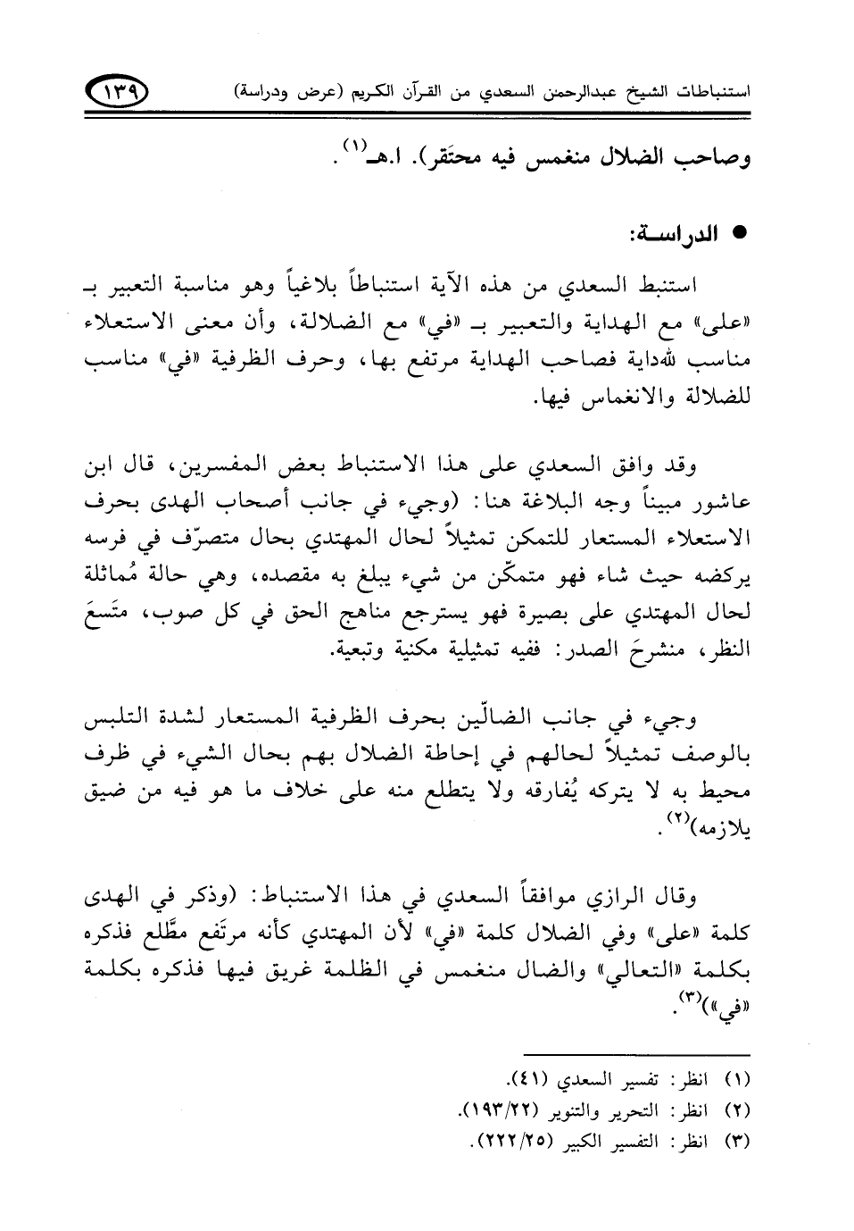 وقال الرازي موافقاً السعدي في هذا الاستنباط: (وذكر في الهدى كلمة " على " وفي الضلال كلمة " في " لأن المهتدي كأنه مرتَفع مطَّلع فذكره بكلمة " التعالي " والضال منغمس في الظلمة غريق فيها فذكره بكلمة " في ") (¬٣).