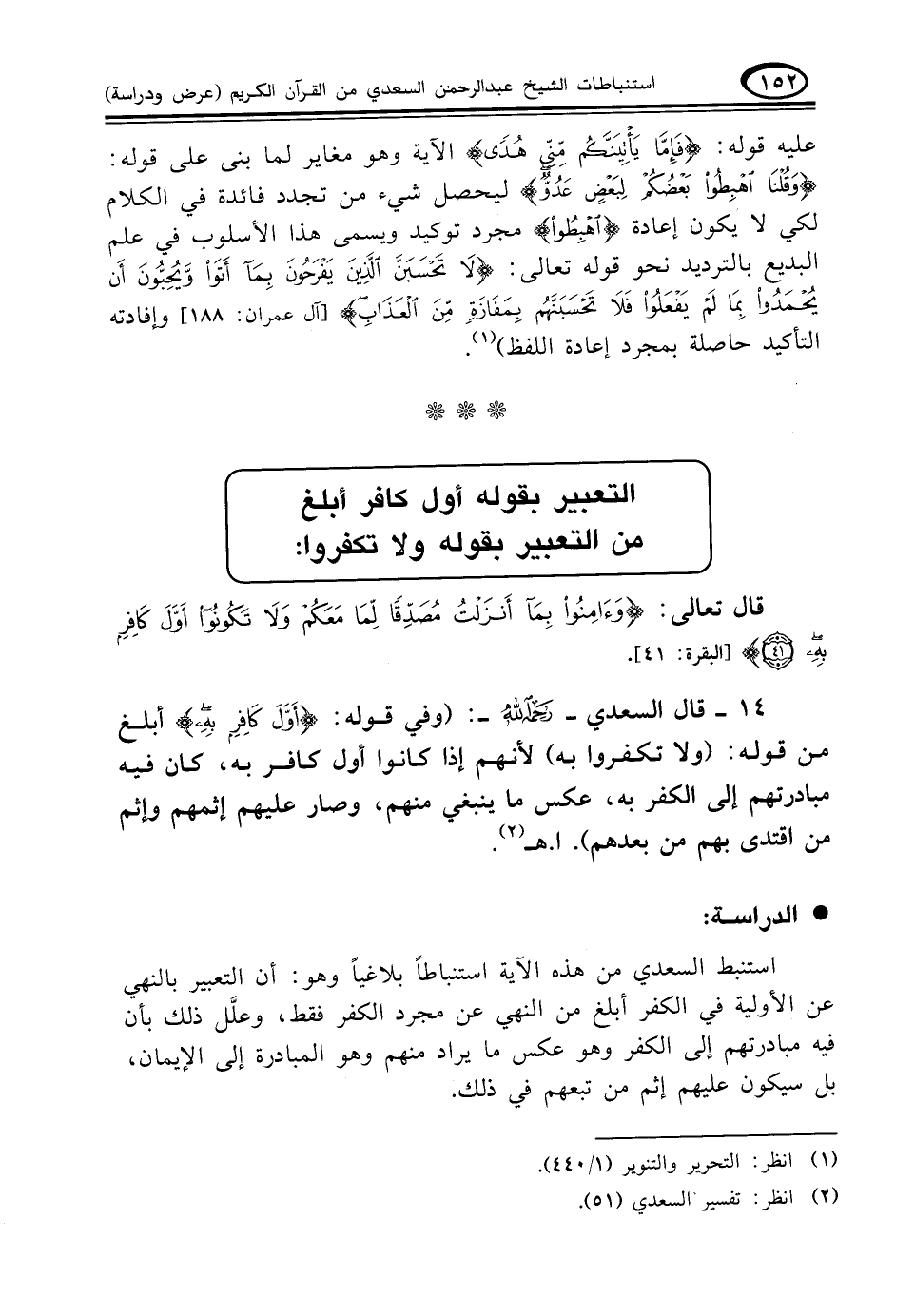 ١٤ - قال السعدي - رحمه الله -: (وفي قوله: {أَوَّلَ كَافِرٍ بِهِ} أبلغ من قوله: (ولا تكفروا به) لأنهم إذا كانوا أول كافر به، كان فيه مبادرتهم إلى الكفر به، عكس ما ينبغي منهم، وصار عليهم إثمهم وإثم من اقتدى بهم من بعدهم) .ا. هـ (¬٢)