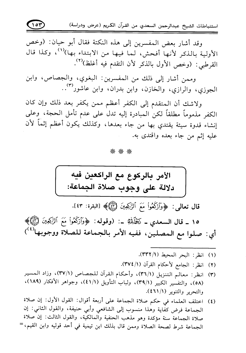 ١٥ - قال السعدي - رحمه الله -: (وقوله: {وَارْكَعُوا مَعَ الرَّاكِعِينَ (٤٣)} أي: صلوا مع المصلين، ففيه الأمر بالجماعة للصلاة ووجوبها (¬٤))