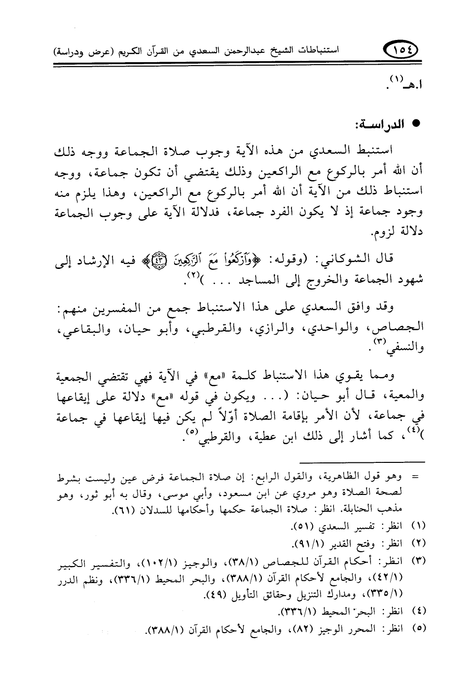 استنبط السعدي من هذه الآية وجوب صلاة الجماعة ووجه ذلك أن الله أمر بالركوع مع الراكعين وذلك يقتضي أن تكون جماعة، ووجه استنباط ذلك من الآية أن الله أمر بالركوع مع الراكعين، وهذا يلزم منه وجود جماعة إذ لا يكون الفرد جماعة، فدلالة الآية على وجوب الجماعة دلالة لزوم.