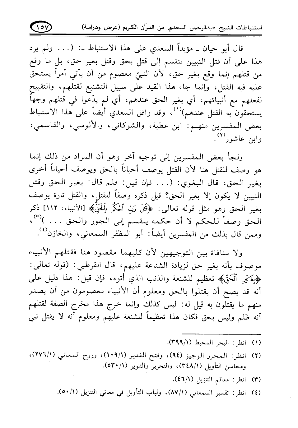 قال أبو حيان - مؤيداً السعدي على هذا الاستنباط: (. . . ولم يرد هذا على أن قتل النبيين ينقسم إلى قتل بحق وقتل بغير حق، بل ما وقع من قتلهم إنما وقع بغير حق، لأن النبي معصوم من أن يأتي أمراً يستحق عليه فيه القتل، وإنما جاء هذا القيد على سبيل التشنيع لقتلهم، والتقبيح لفعلهم مع أنبيائهم، أي بغير الحق عندهم، أي لم يدّعوا في قتلهم وجهاً يستحقون به القتل عندهم) (¬١)، وقد وافق السعدي أيضاً على هذا الاستنباط بعض المفسرين منهم: ابن عطية، والشوكاني، والألوسي، والقاسمي، وابن عاشور. (¬٢)