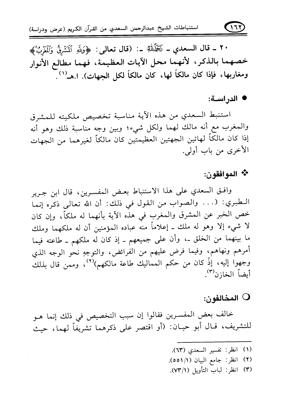 ٢٠ - قال السعدي - رحمه الله -: (قال تعالى: {وَلِلَّهِ الْمَشْرِقُ وَالْمَغْرِبُ} خصهما بالذكر، لأنهما محل الآيات العظيمة، فهما مطالع الأنوار ومغاربها، فإذا كان مالكاً لها، كان مالكاً لكل الجهات) .ا. هـ (¬١)
