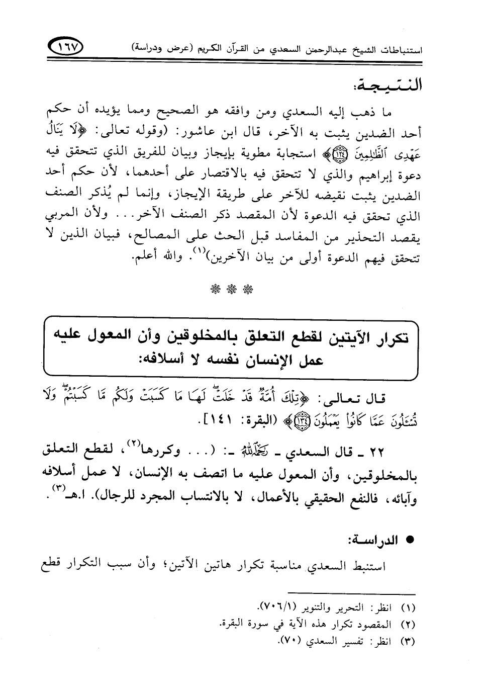 ٢٢ - قال السعدي - رحمه الله -: (. . . وكررها (¬٢)، لقطع التعلق بالمخلوقين، وأن المعول عليه ما اتصف به الإنسان، لا عمل أسلافه وآبائه، فالنفع الحقيقي بالأعمال، لا بالانتساب المجرد للرجال) .ا. هـ (¬٣)
