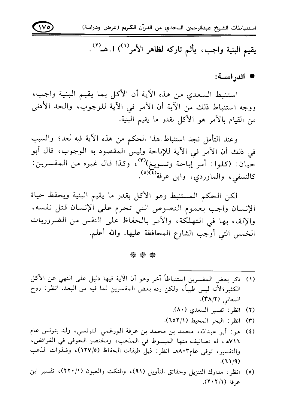 استنبط السعدي من هذه الآية أن الأكل بما يقيم البنية واجب، ووجه استنباط ذلك من الآية أن الأمر في الآية للوجوب، والحد الأدنى من القيام بالأمر هو الأكل بقدر ما يقيم البنية.