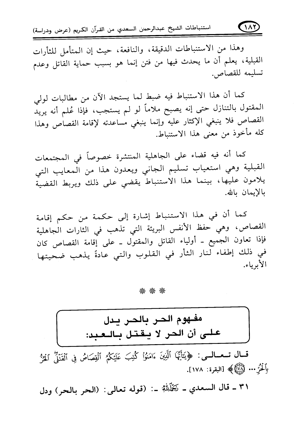 ٣١ - قال السعدي - رحمه الله -: (قوله تعالى: {الْحُرُّ بِالْحُرِّ} ودل