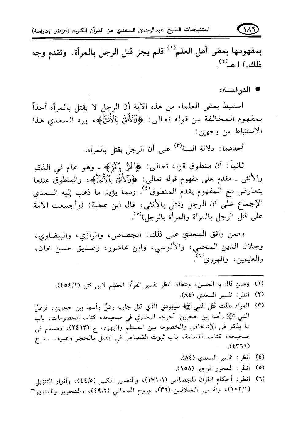 ثانياً: أن منطوق قوله تعالى: {الْحُرُّ بِالْحُرِّ} - وهو عام في الذكر والأنثى- مقدم على مفهوم قوله تعالى: {وَالْأُنْثَى بِالْأُنْثَى}، والمنطوق عندما يتعارض مع المفهوم يقدم المنطوق (¬٤). ومما يؤيد ما ذهب إليه السعدي الإجماع على أن الرجل يقتل بالأنثى، قال ابن عطية: (وأجمعت الأمة على قتل الرجل بالمرأة والمرأة بالرجل) (¬٥).